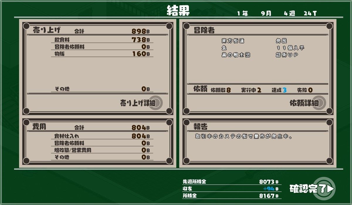 そのターンの収支や冒険者の依頼が達成されたかどうかそれによって何を得たか等々