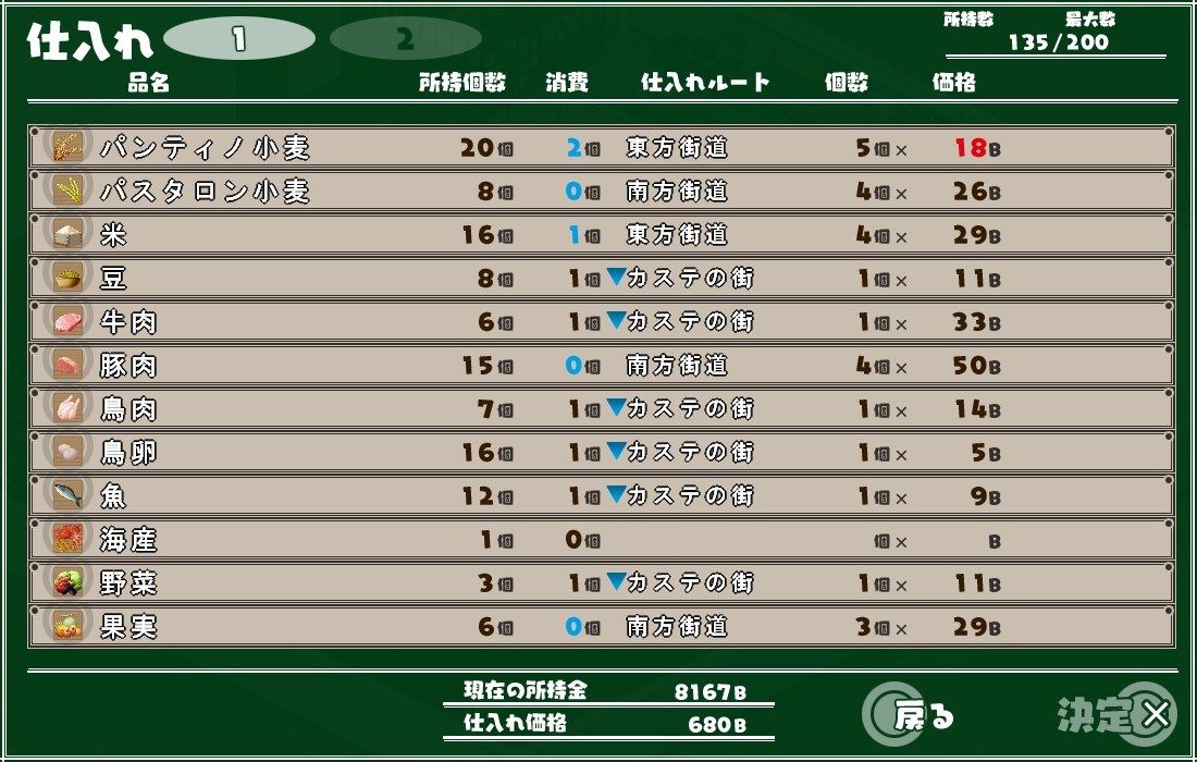 最初はカステの街という要は主人公達が店を経営する街でしか仕入れがないんですが