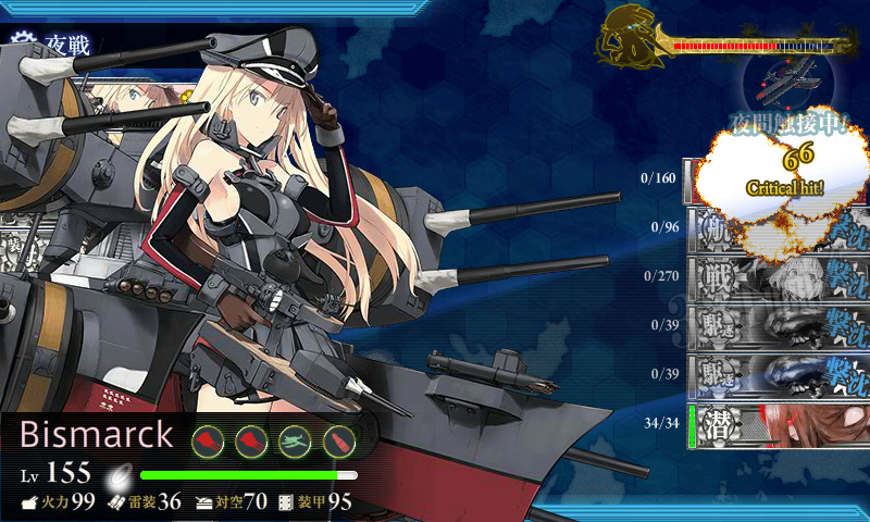 旗艦のヲ級改が残り20だから昼戦で終わるなーと思ってたら誰も狙わず|д・) 最後はビス子