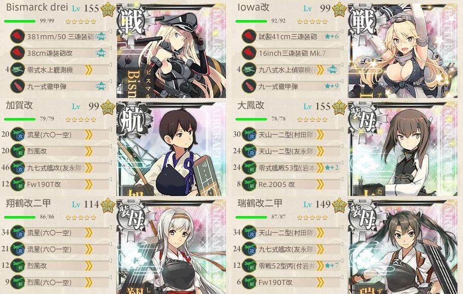 最早恒例の高速戦艦2空母4編成 一応翔鶴瑞鶴を下段にまとめていたり(・◇・)