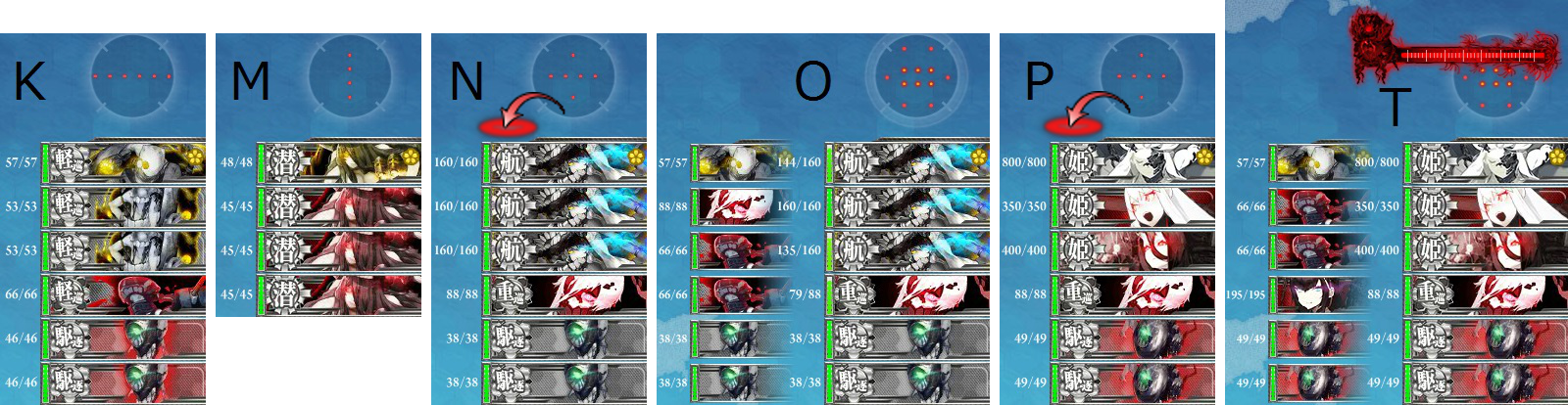 初めは長門いれた低速編成や高速戦艦編成していたが、潜水やoマスで撤退が続いた為、ギミック破壊を決断。