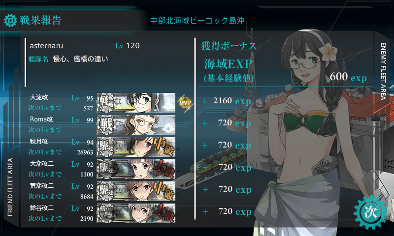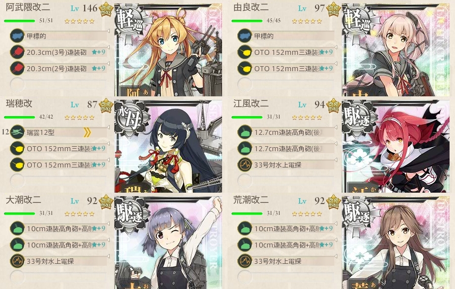 駆逐艦編成が条件なのでちょっと羅針盤に悩まされましたがまぁ2-4ですしこんなもんでしょうか。