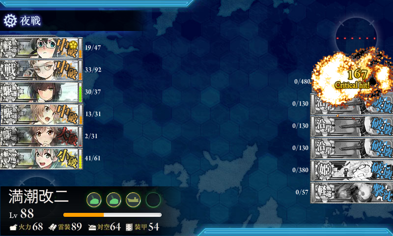 離島棲姫と集積地棲姫残しで夜戦へ突入して大淀が集積地棲姫を落としてRomaが削って最後は満潮でした。
