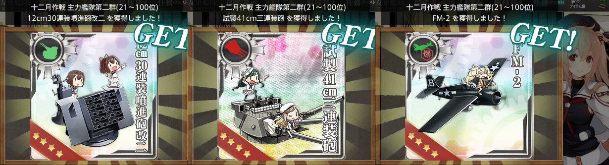 十二月作戦の武勲褒賞新装備は[FM-2][12cm30連装噴進砲改二][46cm三連装砲改][彩雲(偵四)]