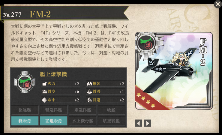 まずは[FM-2]パッと見の性能は爆戦っぽいですけど図鑑に【対艦・対地の汎用支援戦闘機】と書いてあるのが気になる。
