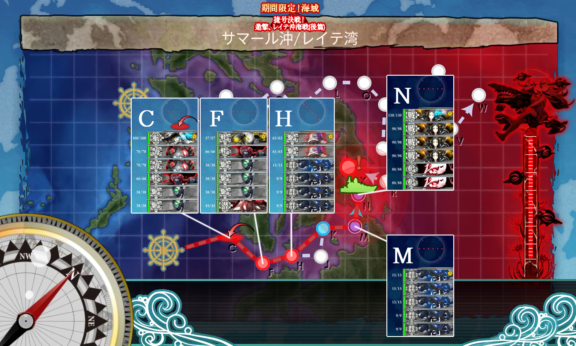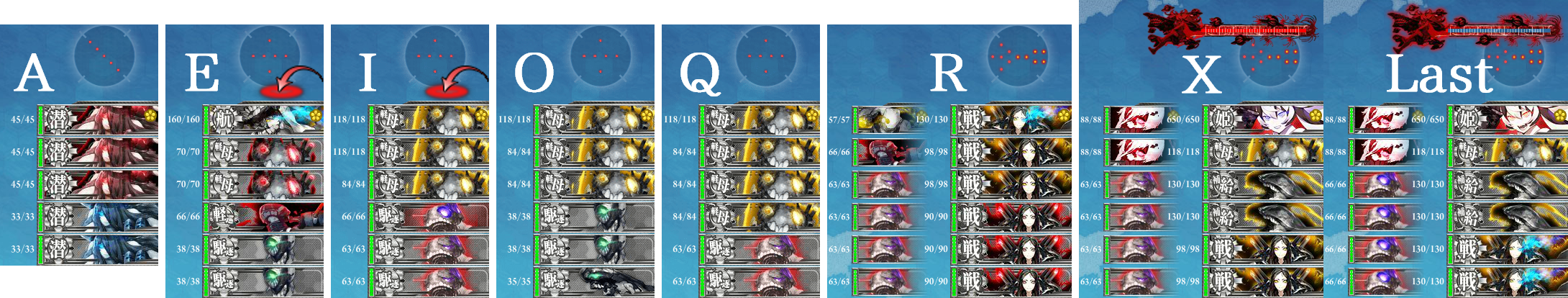 4,5戦目(O,Q),ヌ級改が非常に厄介、強編成だと航空優勢も厳しくなるので道中支援である程度対処したいところ。