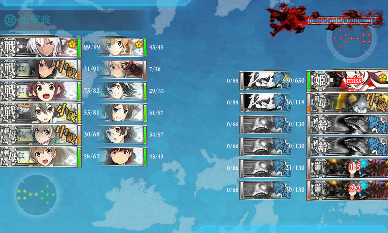 あと戦艦の命中率低下は致し方無い事なので、通常海域のように金剛型に試41を積むのではなくダズルや試36砲、ビス子砲やウォースパイトの砲を積み電探という手もありますよ。自分も武蔵と長門がよくはずしたので電探と徹甲弾を交互に積んでやっていました…