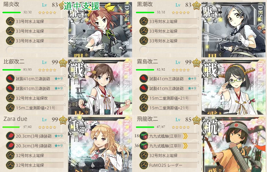 ちなみに道中支援は全キラ、決戦支援なら旗艦だけキラ付けで私は送ってます。