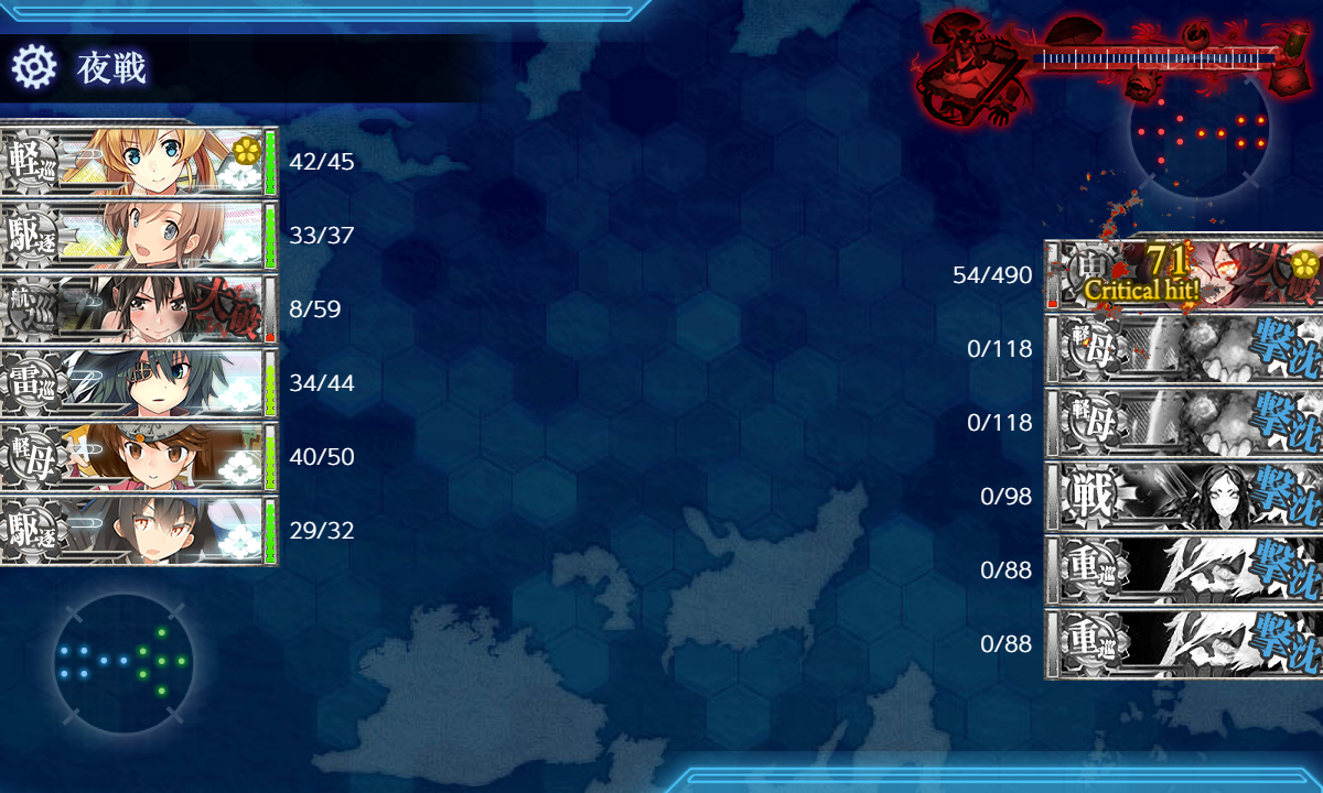 夜戦までに残り80-90まで削っても落とせないことがあり、かなりはらはらしました。さすがに最後は夜戦までに30まで削って落としましたが…。