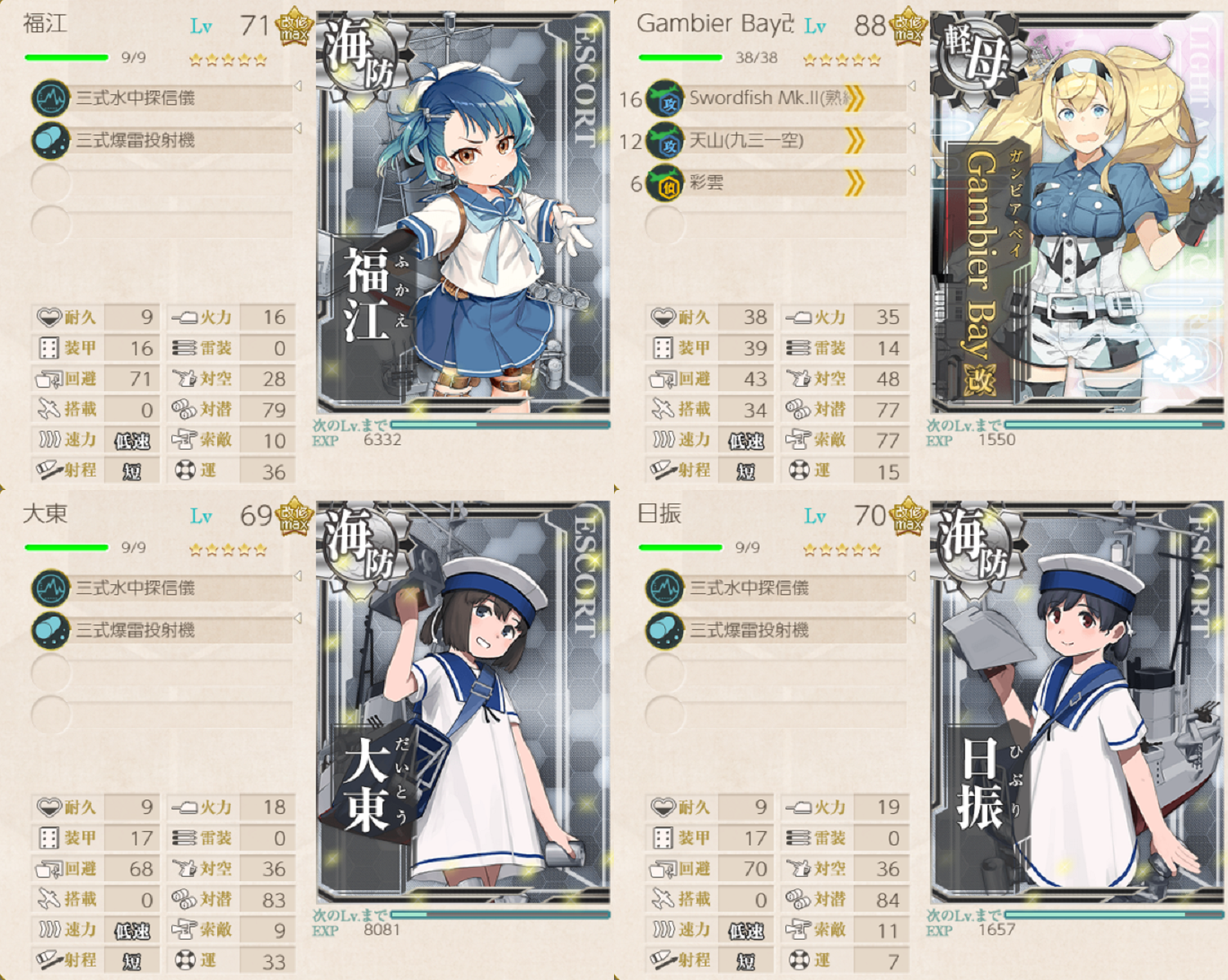 [#1-5]は海防艦4でも良いんですが「Gambier Bay」ももう少し育成したかったので旧編成のまま。
