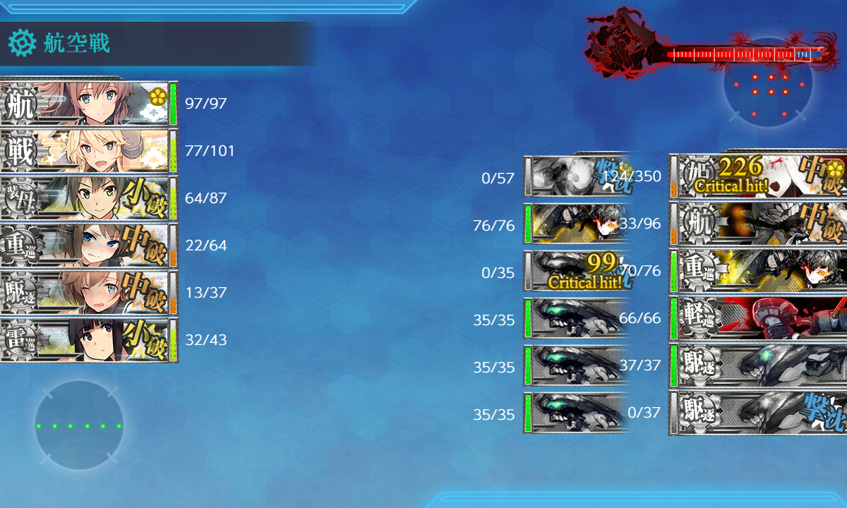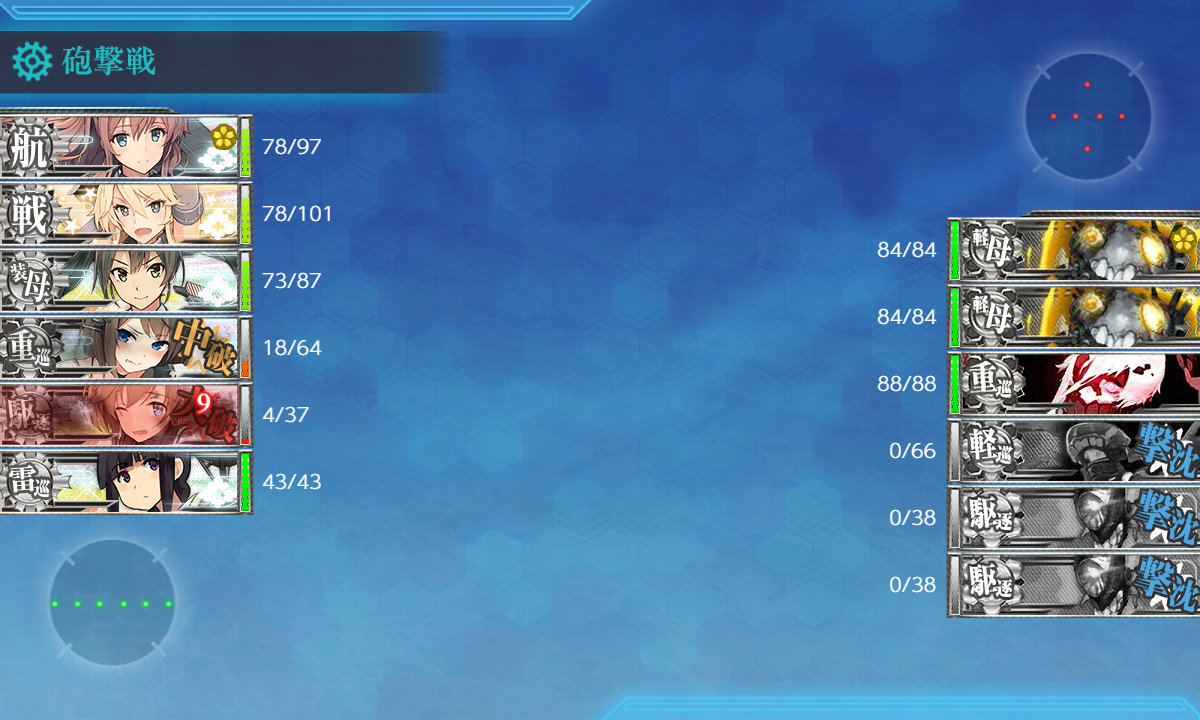 相手艦載機を全撃墜して余裕の昼戦END 北上が2damage受けてなかったら完全勝利だったんですがまぁ良し