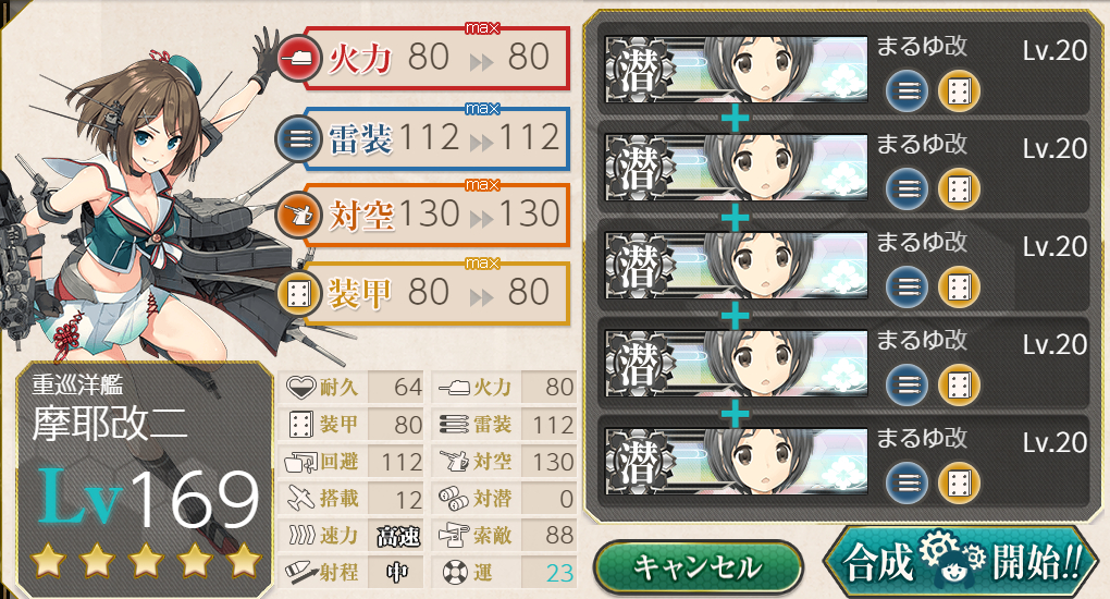 まぁ魚雷CIは駆逐艦と「阿武隈」に任せられるので重巡枠は正直連撃の削りでも充分ですしゆっくりやっていきます。