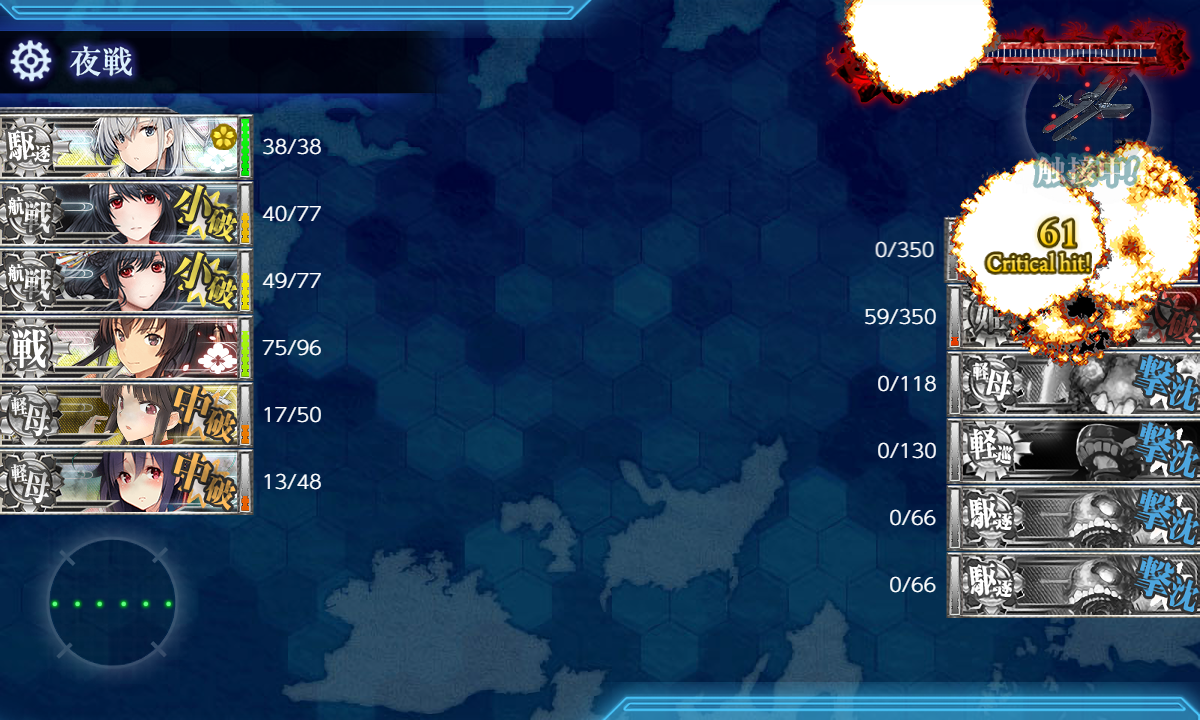 5戦目(R),[輪形陣]空母棲姫が固定なので事故率高め。ここまでで被弾している可能性も高いので……