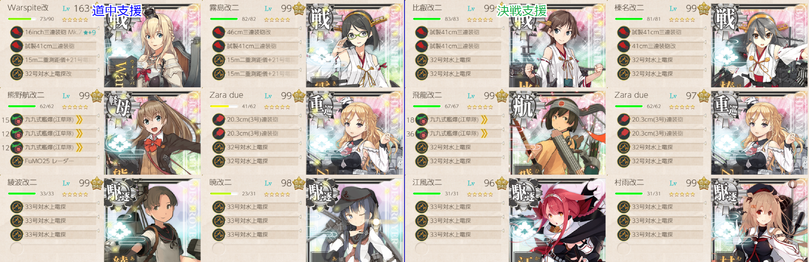 道中支援(左)は全艦キラキラ、決戦支援は旗艦のみキラキラ。最初は送ってなかったんですが送らないときついかも。