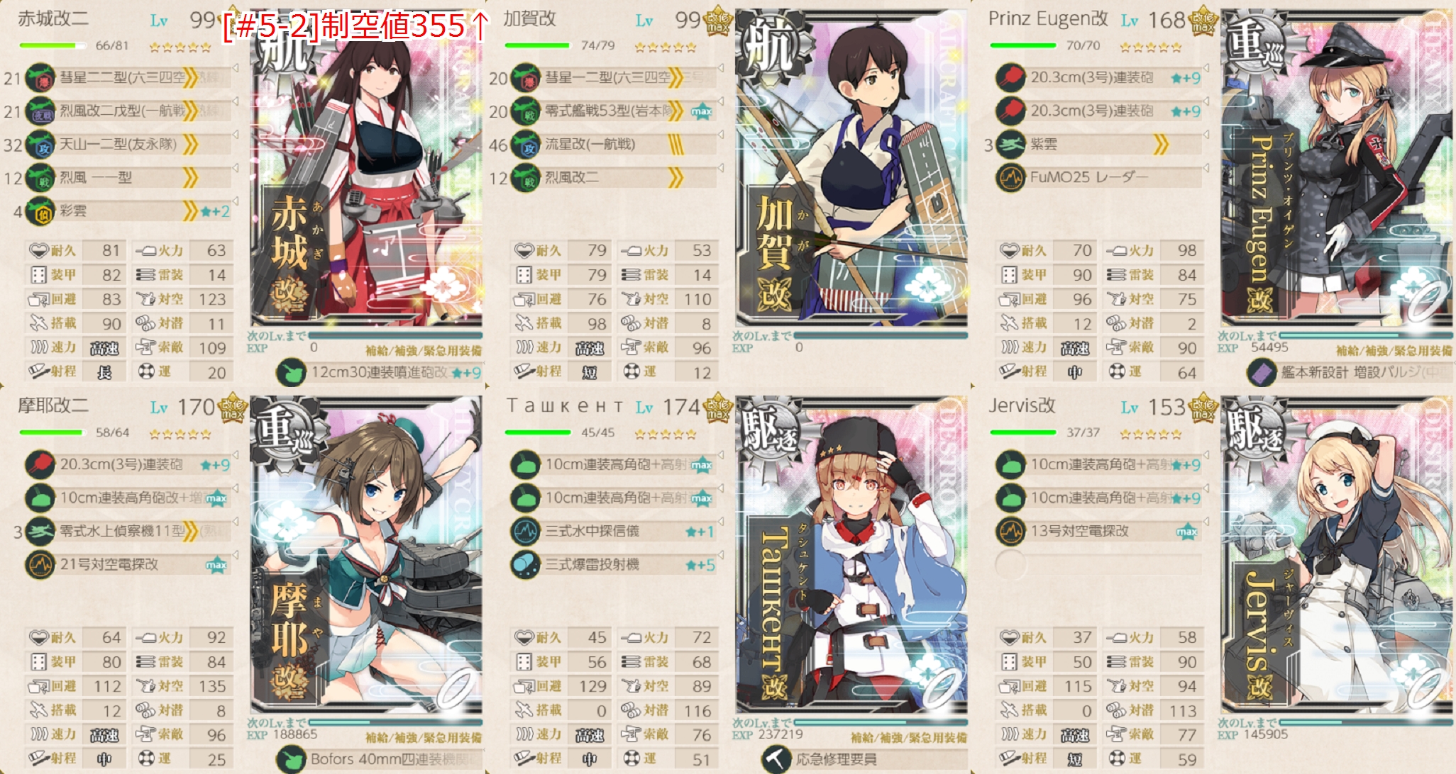 6-5も無難に上√なので同じ編成。一応全員の増設に機銃積載したけど、空襲マスで小破未満からの大破で1回撤退しましたw