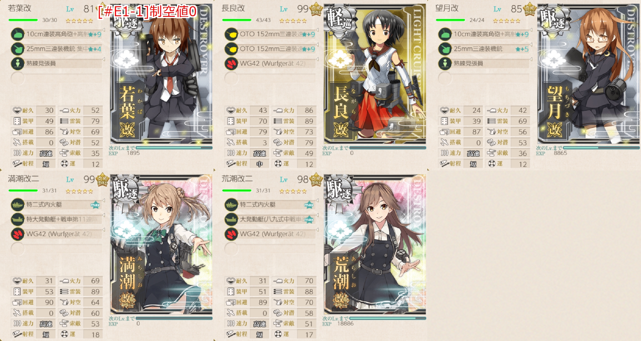 (長良改Lv94、大潮改二Lv73、荒潮改二Lv71、若葉改Lv63、子日改Lv60)