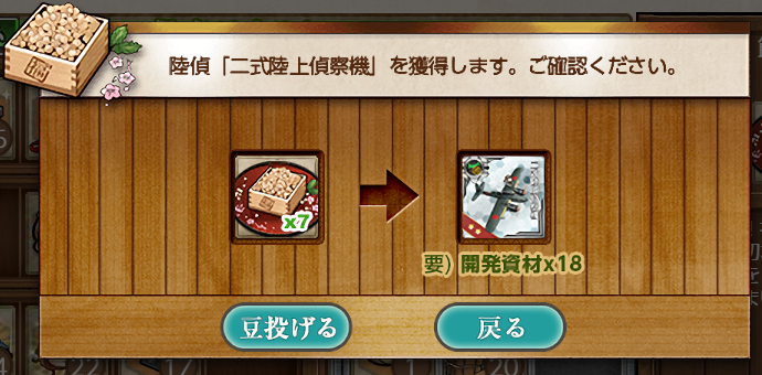 それはさておきとりあえず豆を投げて"二式陸上偵察機"を貰っておきました₍₍ (ง ˘ω˘ )ว ⁾⁾