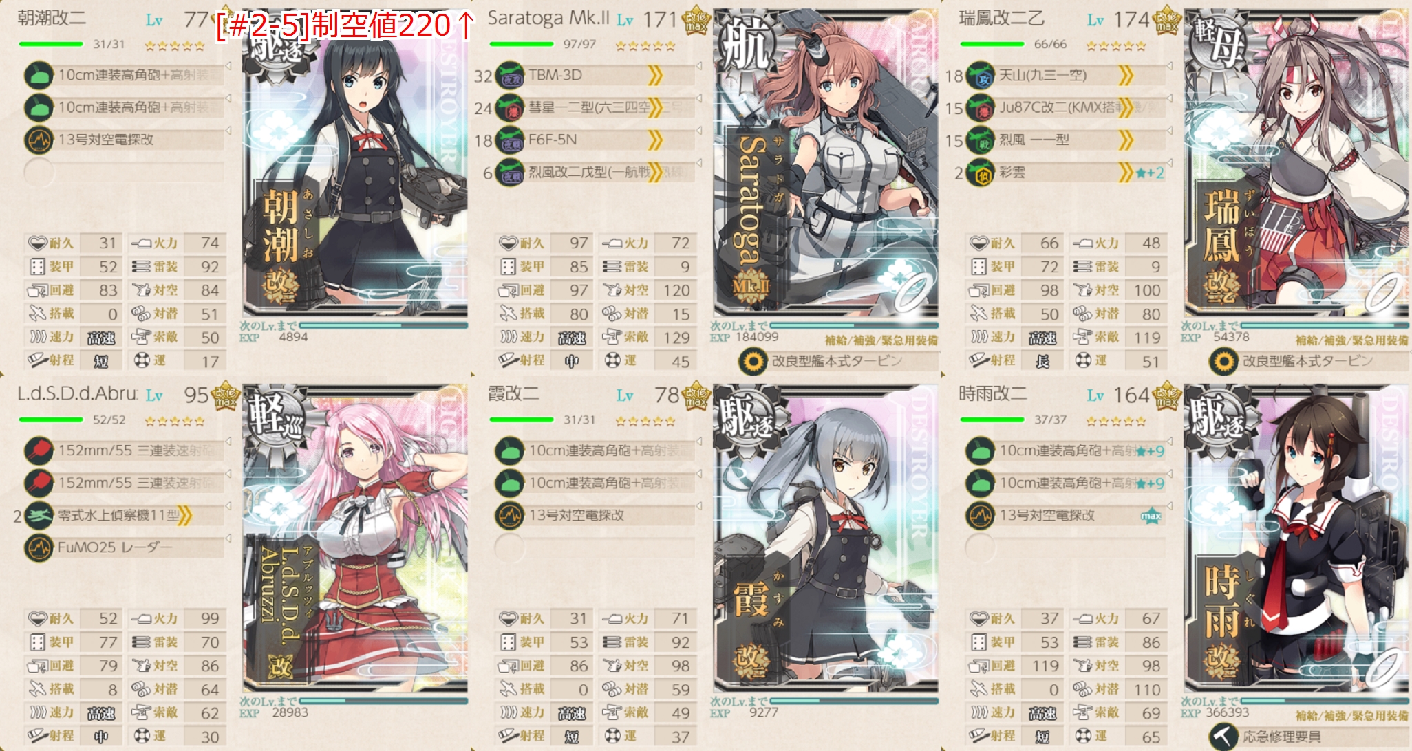 今月の[#2-5]は任務編成からなんですが「夕張」任務の時と違って【「水上反撃部隊」突入せよ!】の条件を満たせるので同時消化する形。いつもの「時雨/Jervis」より練度が低いですが大きくは変わらないはず(・◇・)