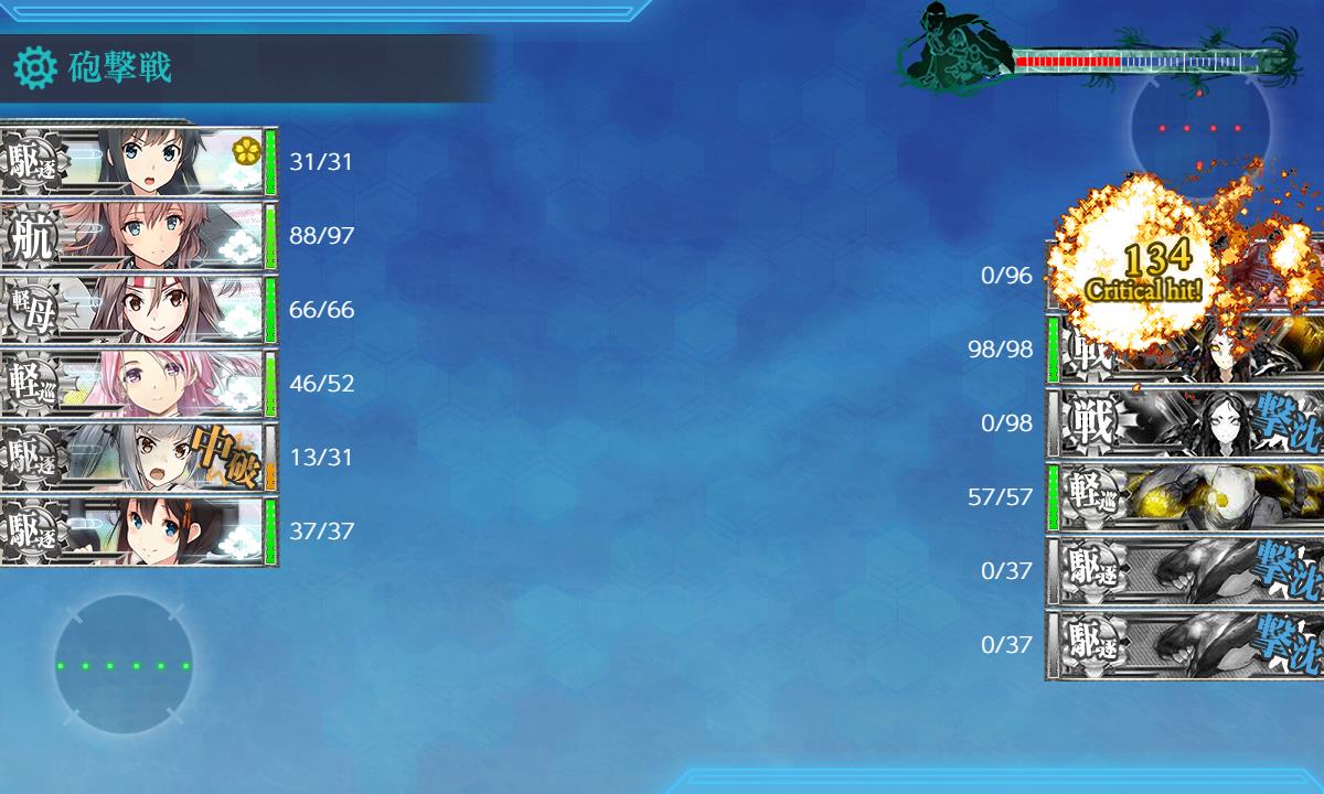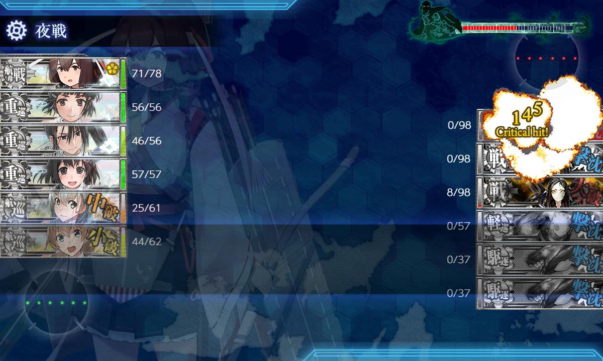 早々に駆逐は落とせたもののその後が続かず夜戦要員4人で4隻残しと危ない状況でしたが1隻ずつ落としてS勝利。