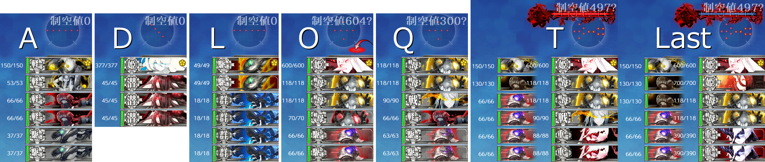 5戦目(Q),[第四陣形]削り段階では輪形陣パターンもあって最終形態では単縦陣固定っぽいので"ヌ級改/タ級/ツ級(改)"がかなり厄介。脆いところが狙われたら大破の危険もありますし火力役が中破になるのも痛い。