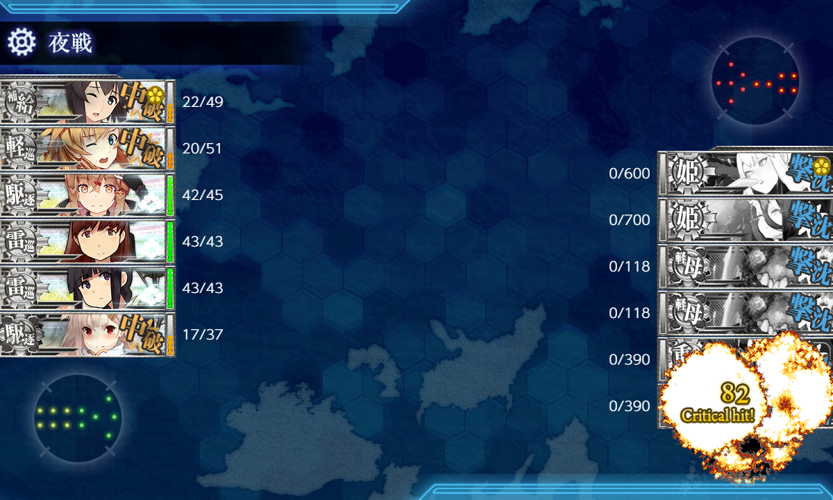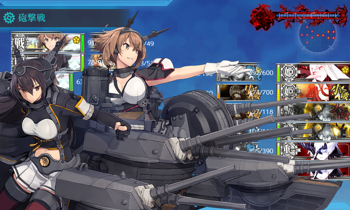 特殊砲撃が発動して姫級1~2隻↑を落とすことが出来ればその後の砲撃戦でも余裕が生まれるのであとは夜戦で撃破を狙う形。ただ第二艦隊がそこそこ残りやすいのでそこをどうやって落とすのかをしっかり考えた方が良いです。
