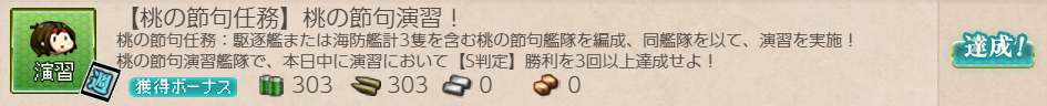 "駆逐/海防"3+自由枠3で同日中に演習で3回S勝利すると達成。