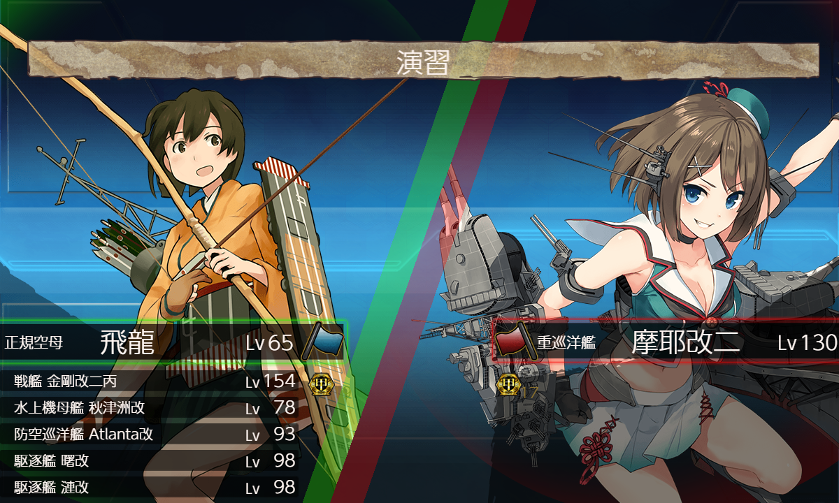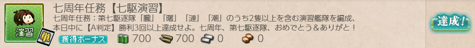 「朧」「曙」「漣」「潮」から2+自由枠4で同日中に演習で3回A勝利↑すると達成。