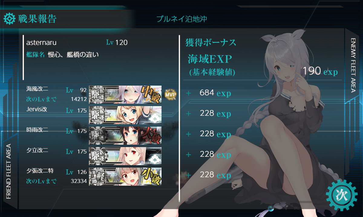 イベントまでの期間は[#7-1]で戦果を稼ぎ続ける予定ですしそこに連れて行けば到達しそうな気もしますけど「Johnston」も2人育成済みですし急いで育成する程ではないですかねー。今のペースでも後段作戦までには間に合う気もしますし仮に[#7-1]に連れ回すにしてもイベントが始まって警戒陣が出てきてからで良いでしょう(・◇・)