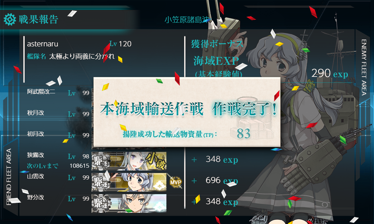 "輸送護衛部隊"なので"空母棲姫"はそこそこ脅威ですが基地航空隊も送れますし何より輸送ゲージということでA勝利でTPは稼げるので特に難しくありません。今後の特に第三段階に向けて編成しそうな艦娘を編成して楽しましょう。