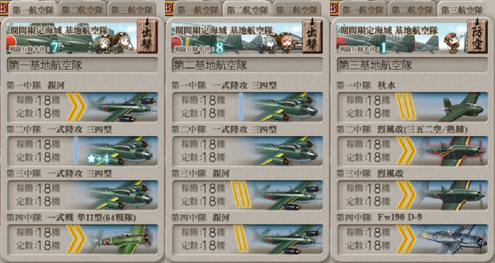 もし重巡入り編成で道中1戦増やしたら第二航空隊は"Hマス"に1回、"Iマス"に1回が良いと思います。