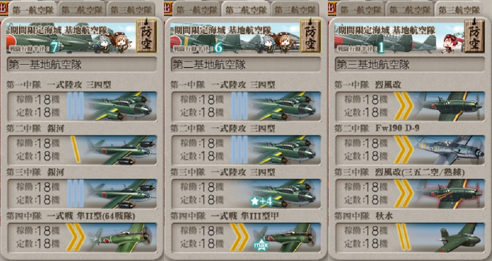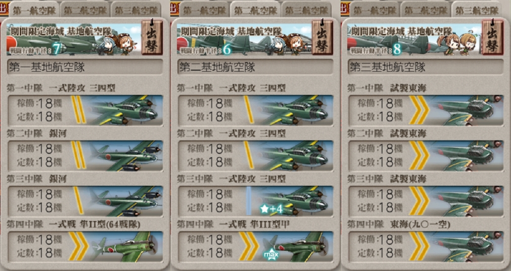 基地航空隊はなしでも良いと思いますが一応第一航空隊を"Iマス"に集中、第二航空隊を"Rマス"に集中、第三航空隊を"Mマス"に集中。"Iマス"は行動半径3、"Rマス"は行動半径5、"Mマス"は行動半径4。