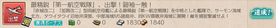 報酬:最精鋭「第一航空戦隊」、出撃!鎧袖一触!前者が特に悩ましい選択でしたが諸々を考えて"一式陸攻 三四型"★2と"流星改(一航戦/熟練)"★2を選択しました。