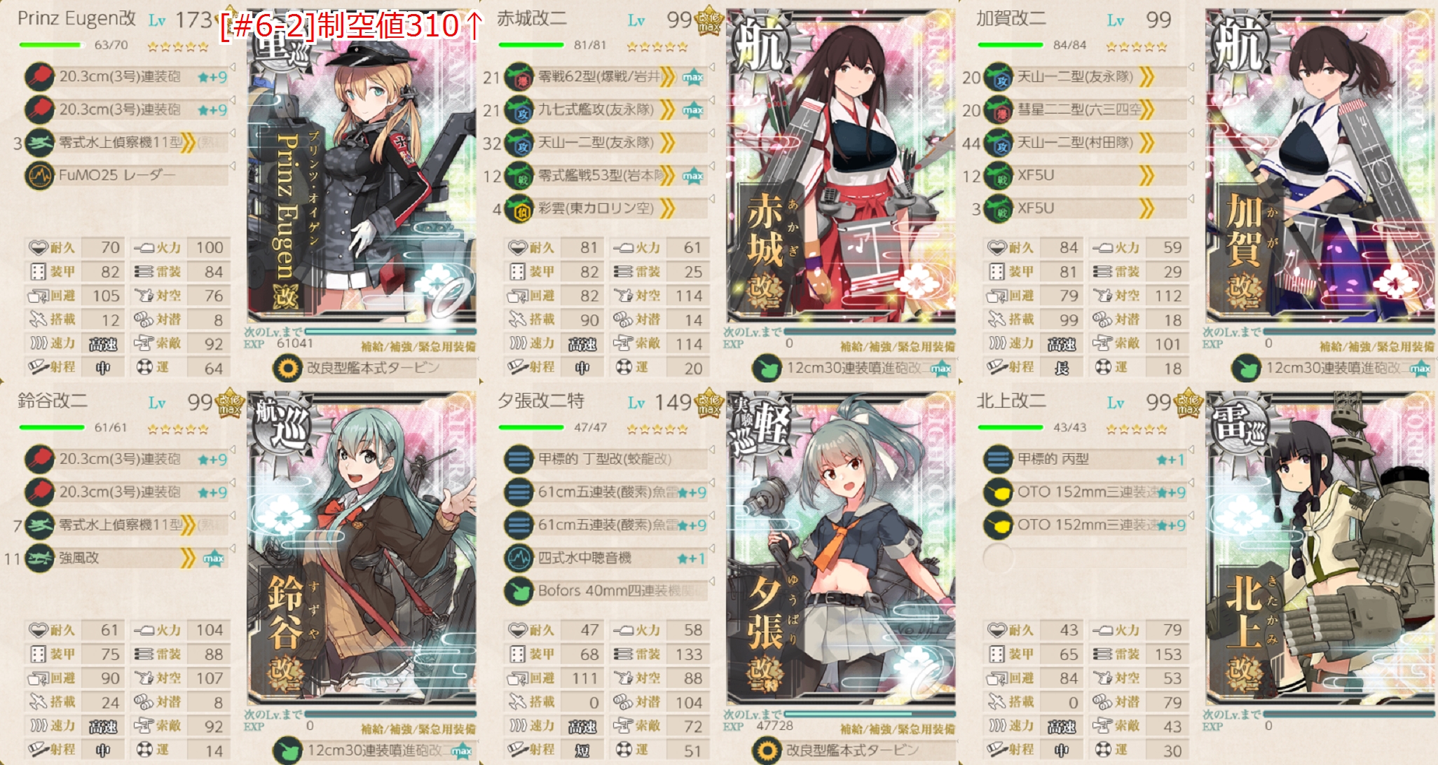 いつもは空母なし編成で出撃してますが指定されているので航空優勢↑を取る形の編成。