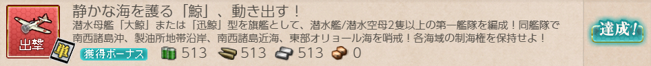 ちなみに報酬の[燃料×513/弾薬×513/鋼材×513」は「たいげい」がSS-513なのでそこからでしょうね。