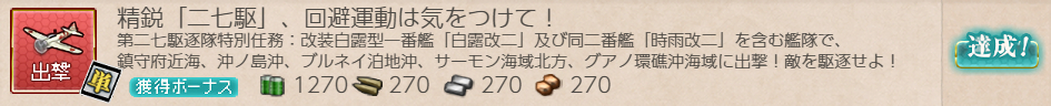 「白露改二」+「時雨改二」+自由枠4で[#1-5/#2-5/#7-1/#5-5/#6-3]ボスを各1回S勝利すると達成。