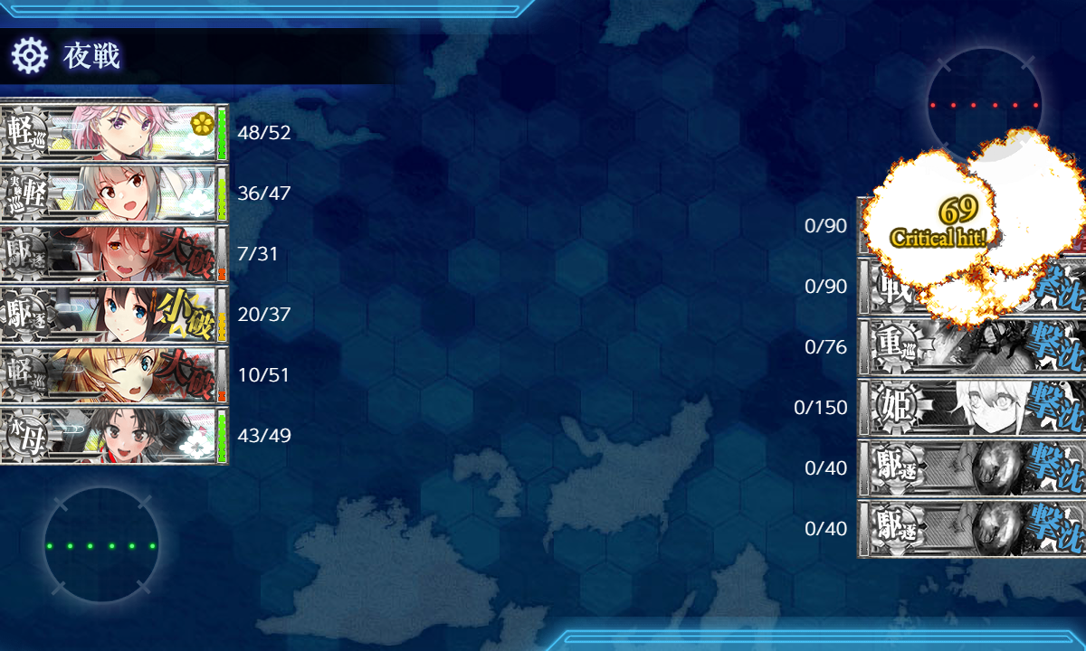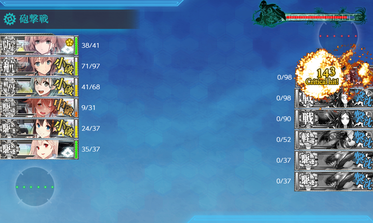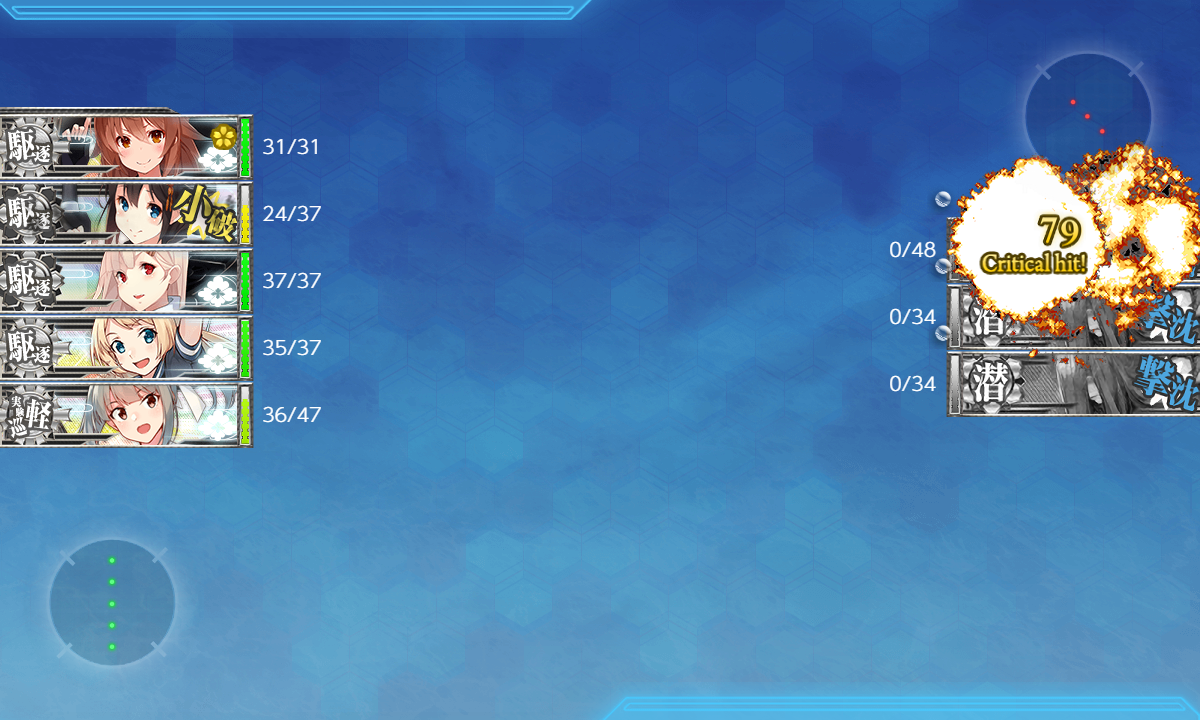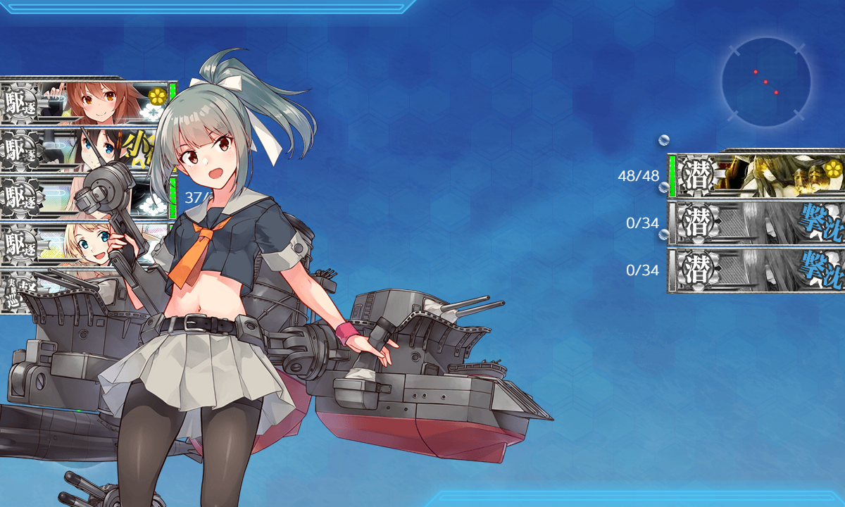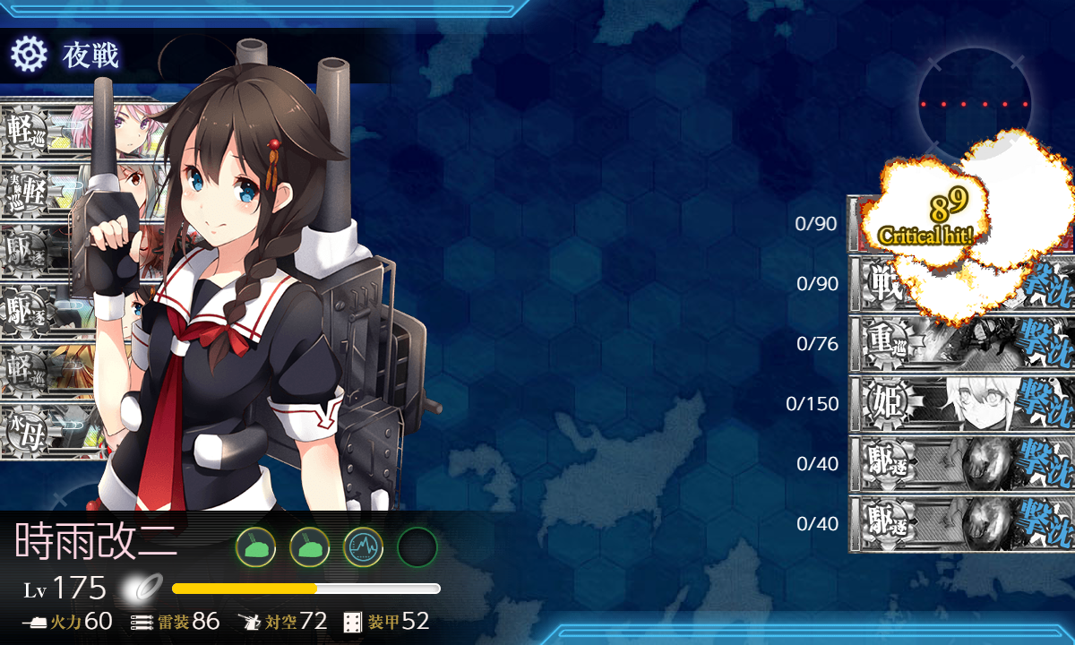 削り段階ではボス編成の潜水艦が貧弱でソナーしか搭載してない「時雨」が単縦陣でも先制で撃破していたので「白露/時雨」は秋月砲×2+ソナーで対空役が一番かも?ゲージ破壊後は潜水艦が強化されるので少なくとも1人は対潜特化推奨。