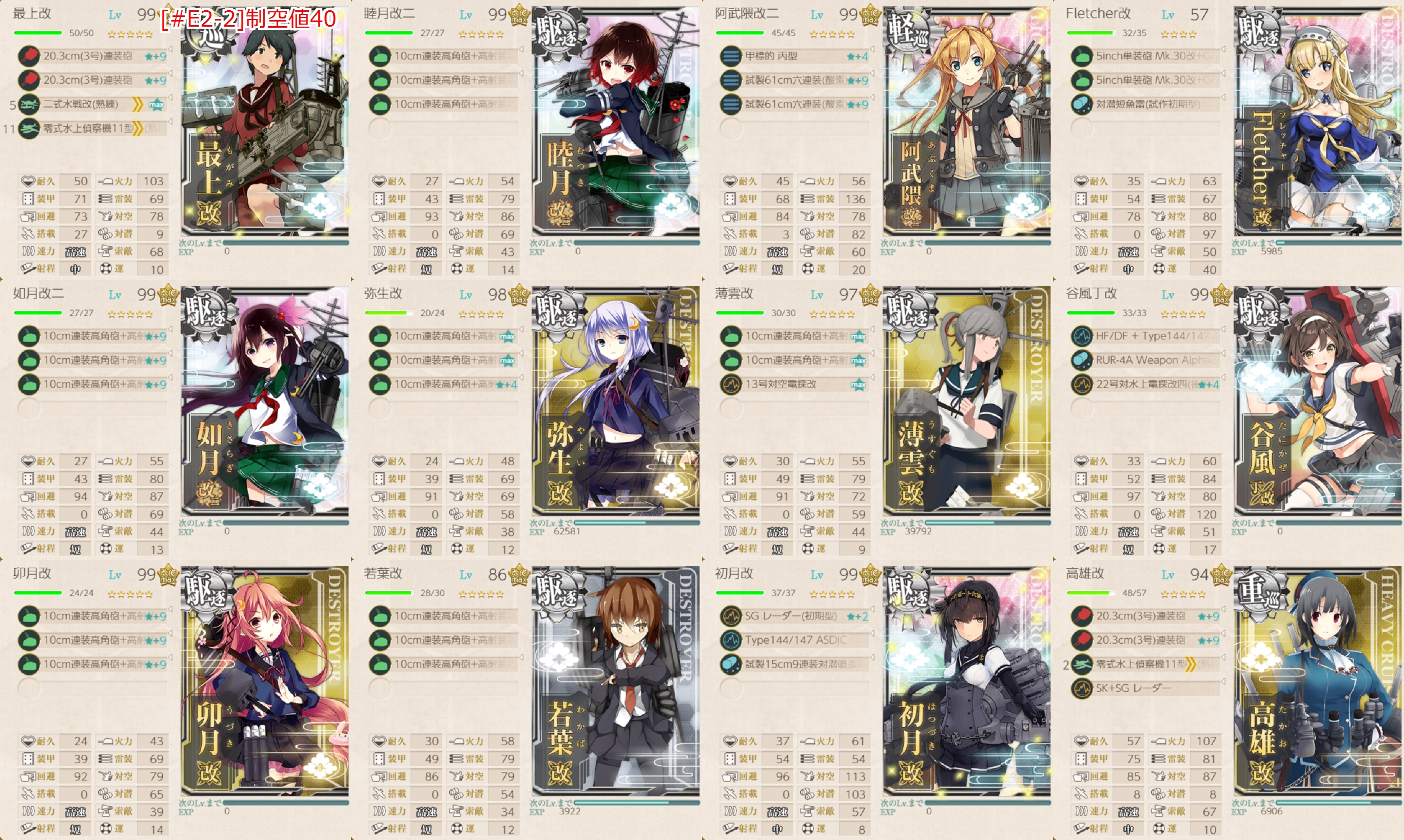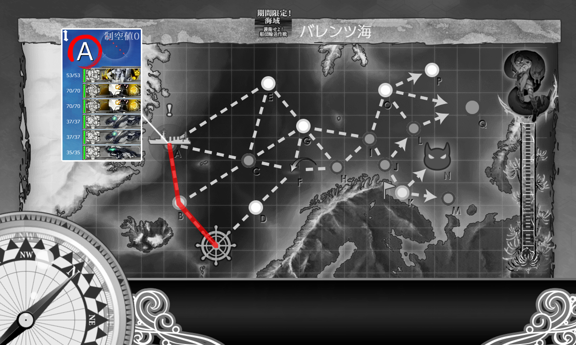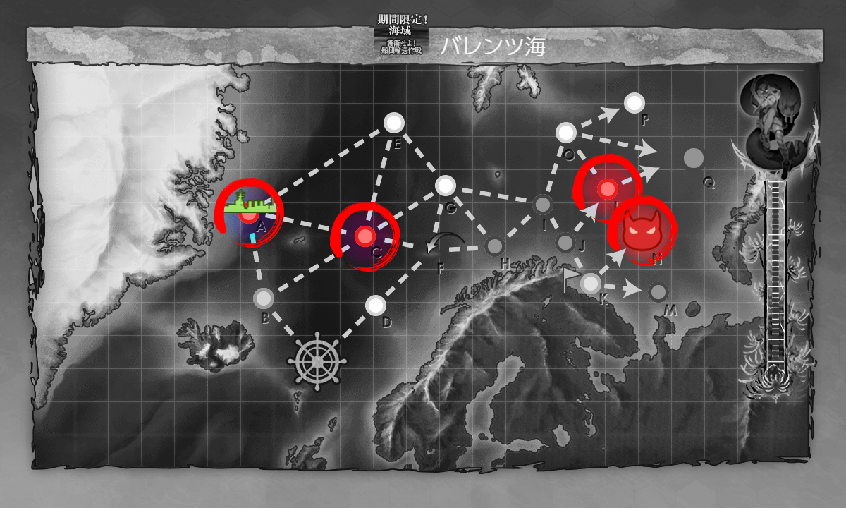 2020年11月28日 21:41 2020秋イベ #E2-2甲 前哨戦(海域拡張)【バレンツ海海戦】 カテゴリ:onlineGAME艦隊これくしょん コメント数:コメント(5) #E2-2甲 前哨戦海域拡張第二段階が始まっていますがまずは海域拡張ギミックをしていきます(。・Д・)ゞ CマスS勝利NマスS勝利LマスS勝利AマスS勝利条件は恐らくこの4つ。道中通るマスで勝手に達成しているものもあるかも。 特に難しい条件はありませんし簡単に終わるはず。例によって例の如く条件を達成して母港に帰るとSEが鳴ります。 手順1手順2手順3海域拡張←Click切替 CマスS勝利+NマスS勝利 まずは"Cマス/NマスS勝利"を狙いにいきます。要は第一段階と同じことをするんですが輸送装備が要らないので少し楽。 私の編成(輸送護衛部隊)▼Click 編成は一緒ですが一応装備は換装してます。ただ多分そのままでもいけます(・◇・) LマスS勝利 次は"LマスS勝利"。能動分岐の行き先を変えるだけなので手順1と同じ編成でok。なので編成画像は割愛。 ただ"水上打撃部隊"でも到達出来るようなので戦力等に不安があればそちらも要検討。 あと"Cマス"はこの時でも可。というか通るときに勝手に達成しているはずですけども_(:3 」∠ )_ AマスS勝利 最後は"AマスS勝利"。これが一番簡単というか難しい順に消化してます(・◇・)編成は手順1と同じなので画像は割愛。 海域拡張(短縮√出現)これで短縮√が出現するのであとは攻略するのみ(。・Д・)ゞ タグ :#艦これ#艦これイベント#前段作戦#海域拡張#2020秋冬イベント 艦隊これくしょん(艦これ)ランキングに参加しています。クリックして頂けると励みになります(。・Д・)ゞ 「onlineGAME」カテゴリの最新記事 コメント コメント一覧 (5) 1. Q 2020年12月06日 21:54 甲でNマスS勝利は不要かも知れないです。 jマスS勝利で引き戻されて、改めてNマスS勝利しましたけど音鳴らなかったです。 0 naru がしました 2. Q 2020年12月06日 21:55 すみません。 上の書き込みですが、JマスではなくてIマスでした。 0 naru がしました 3. naru 2020年12月07日 00:49 Qさん>>1,>>2 私が"Cマス"で間違えて撤退してSEが鳴ってから再度"Nマス"に行ってSEが鳴ったので"Nマス"も条件の1つだとは思います。 ただA勝利でも良い?ようなのでその辺りで勘違いが起こっているのかも知れません。 0 naru がしました 4. とあるモブ 2020年12月19日 22:30 先程”PT小鬼がク○”と書きましたが、正確には自分の運がソレだった模様…orz 具体的にはLマスS勝利3回も失敗。 幾ら命中率が低くなる輸送護衛部隊といえど A敗北の連発にはゲンナリの一言。 正直一気にやる気が下がった感もありますが、 懲りずに粛々と攻略を進めます₍苦笑₎。 0 naru がしました 5. naru 2020年12月21日 01:15 とあるモブさん>>4 基地航空隊による補助がないのである程度本体に戦力を割きたいところですねー。 結局温存した艦ばかりなので重巡系とか特効持ちの「Perth」とか編成すれば良かったなーとか今更思ってます。 0 naru がしました コメントフォーム 名前 コメント 記事の評価 リセット リセット 顔 星 情報を記憶 コメントを投稿する 2020秋イベ #E2-1甲(vs戦艦ル級flagship)【バレンツ海海戦】2020秋イベ #E2-2甲(vs重巡棲姫)【バレンツ海海戦】