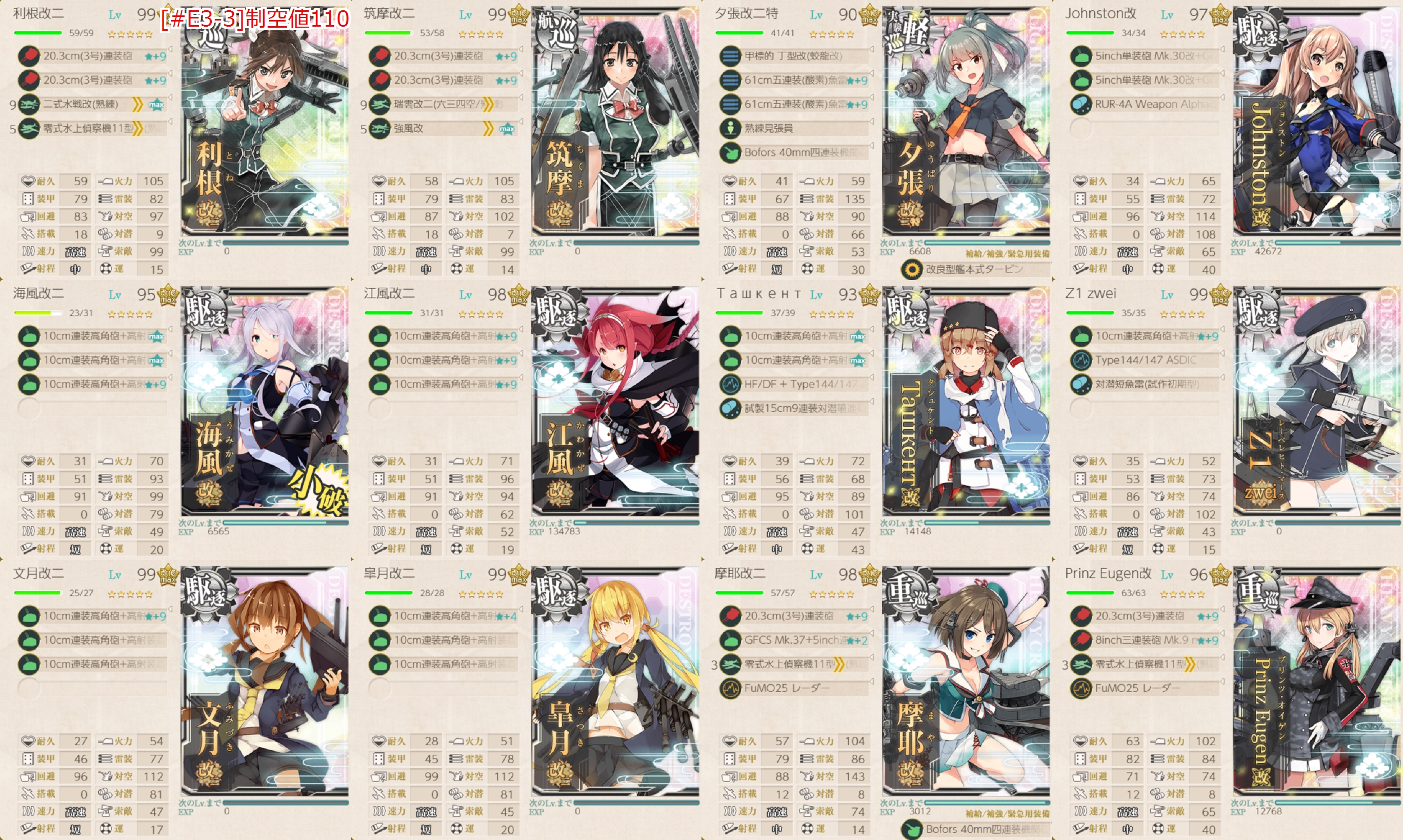 ※「利根」「筑摩」「夕張」「Johnston」「Ташкент」「摩耶」「Prinz Eugen」はサブ。