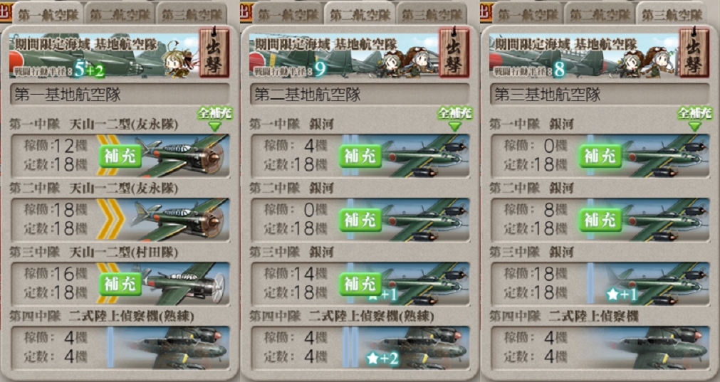 編成が強化されないのでそこを救いと見るべきか最初から強編成固定と見るべきか……あと防空能力が高い敵ばかりなので基地航空隊もボロボロにされます(º﹃º)"ナ級II"に有効打を出しやすい"銀河"を多めに配備したいところ。