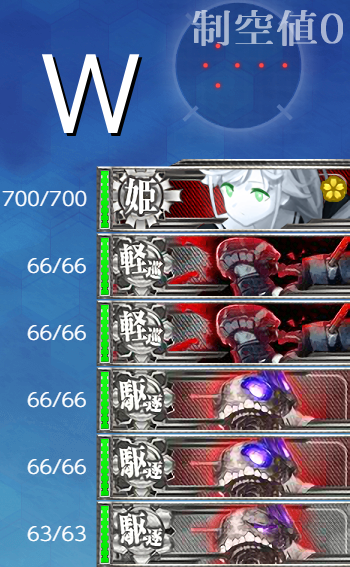 ボス(W),[第四陣形]4隻落とせば良いのでA勝利はなんとかなりますが"駆逐林棲姫"を始め編成はかなり凶悪。