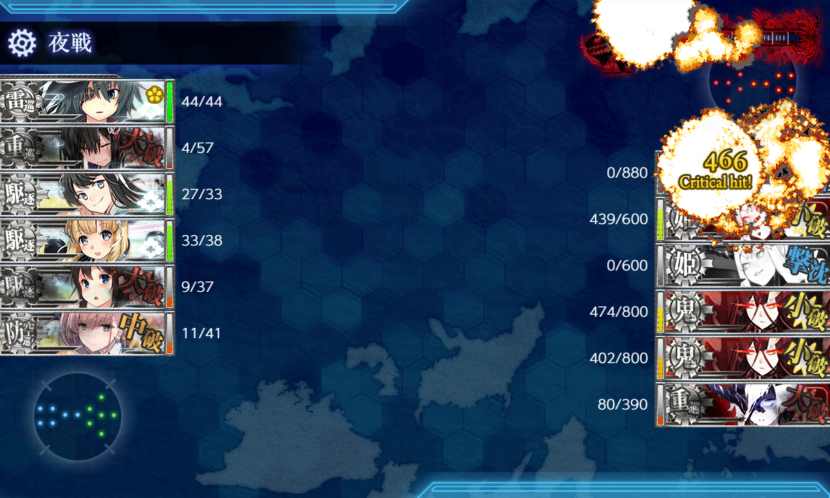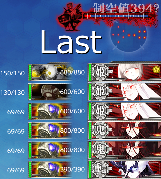 削り段階から姫級4隻で昼戦で落とせるとしたら"空母棲姫改"ぐらいですがそれも相当難しい、ただ逆に昼戦で姫級4隻だけにすることは狙いやすいのであとはこちらの第二艦隊が健在であればあるほど削れる感じです。