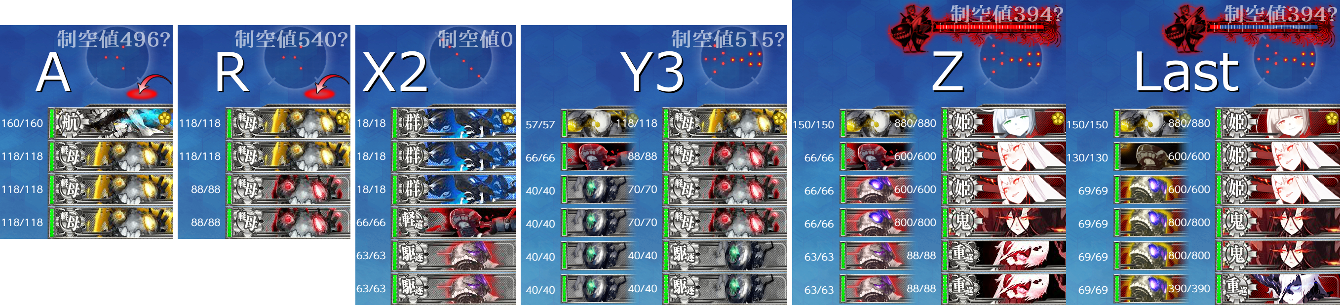 1部隊を[陸戦/局戦]にして"Y3マス"に送るのもありかも知れません。制空値が削れて航空優勢も取れますし"ヌ級改"を沈黙させられる可能性もあるのである程度は安全に通れるようになるはず。ちなみに制空値349↑で航空拮抗調整になります。