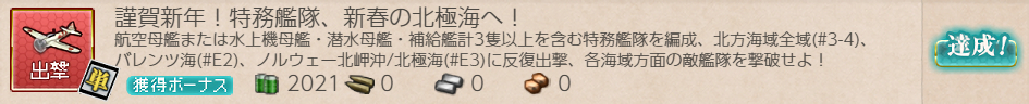 "空母/水母/潜母/補給3"+自由枠3で[#3-4/#E2-2/#E3-3]ボスを各2回A勝利↑すると達成。
