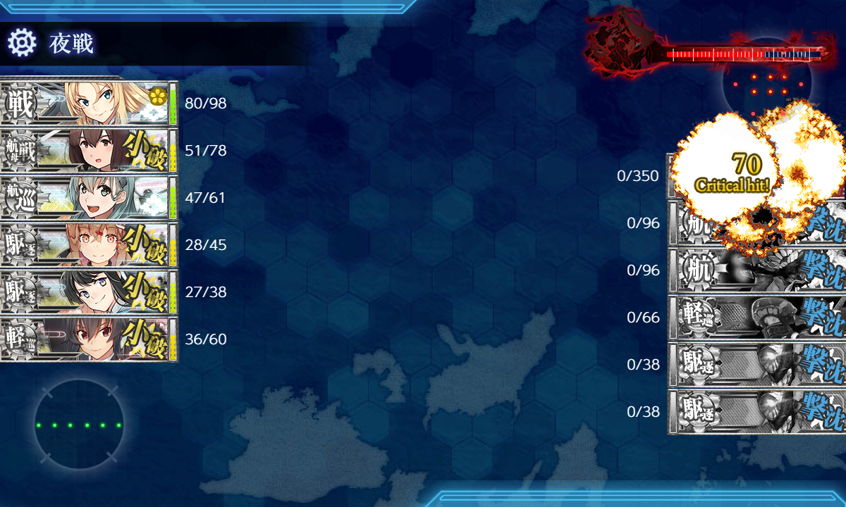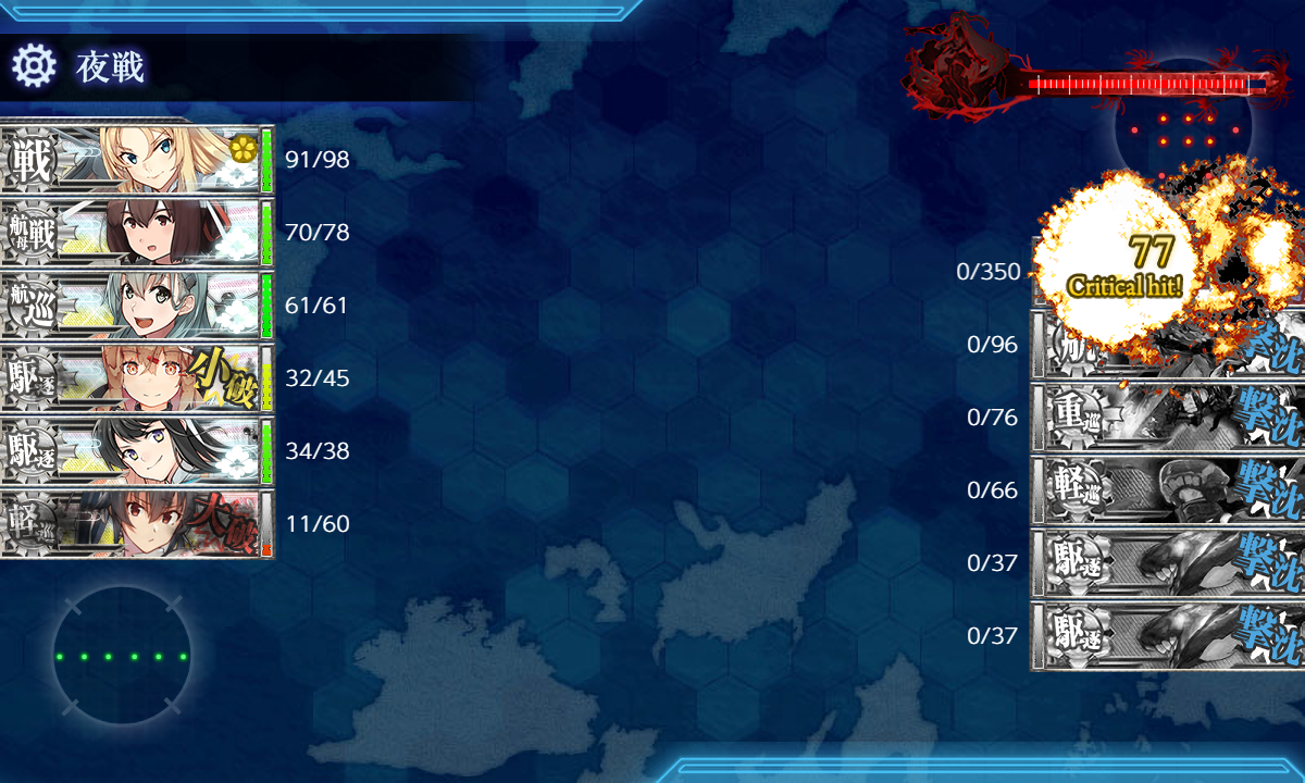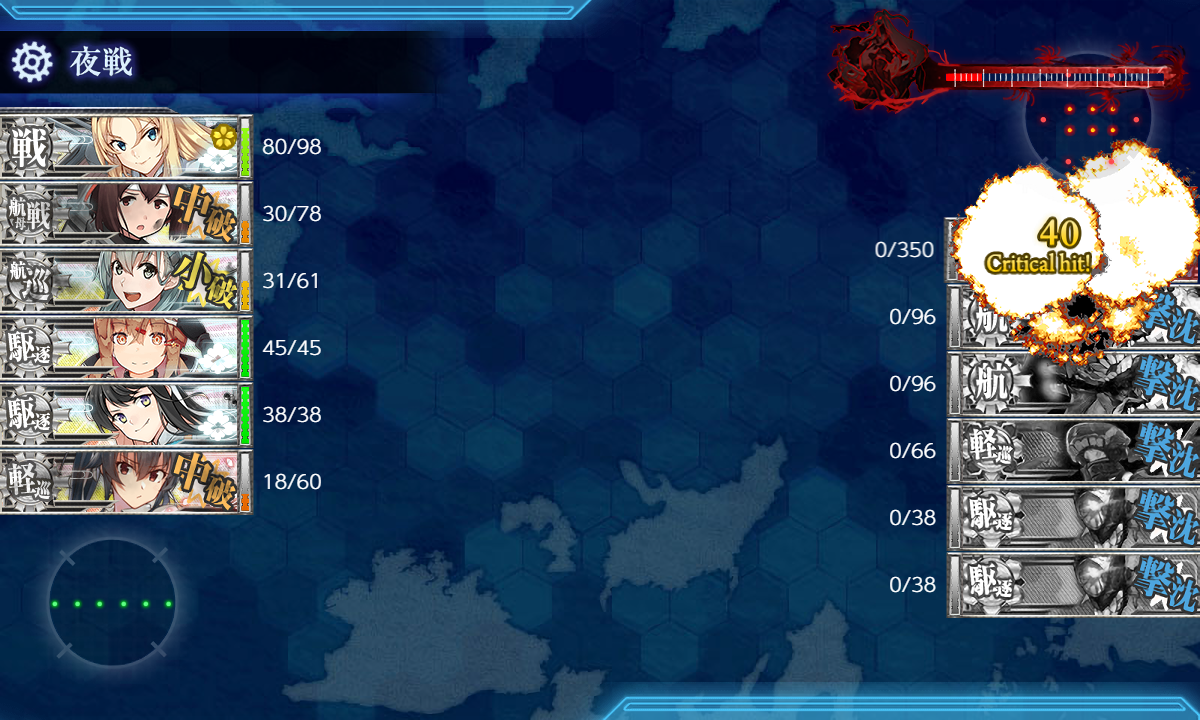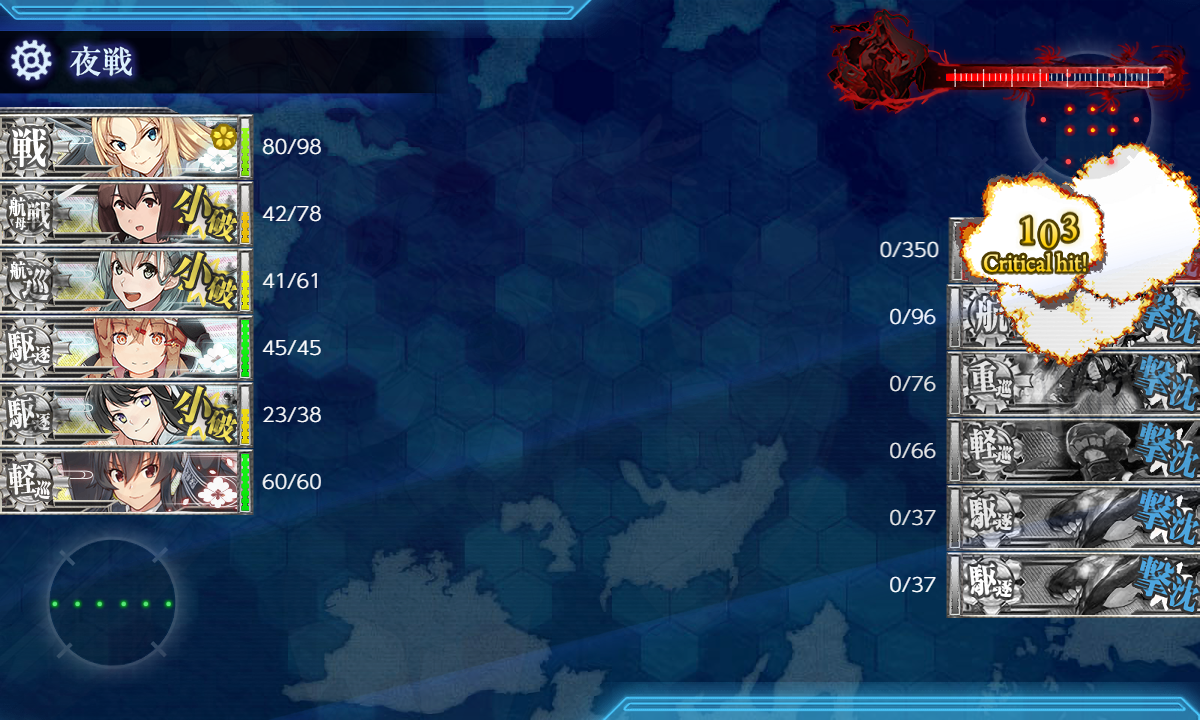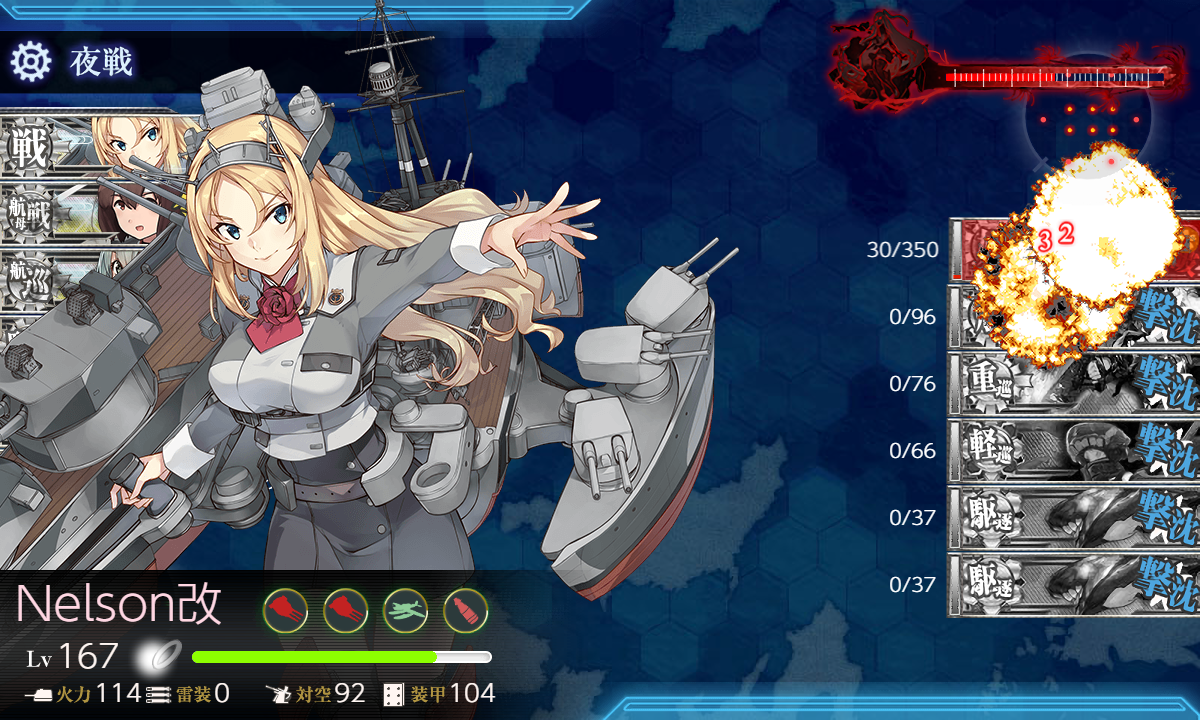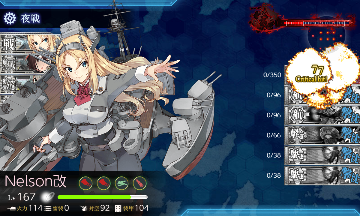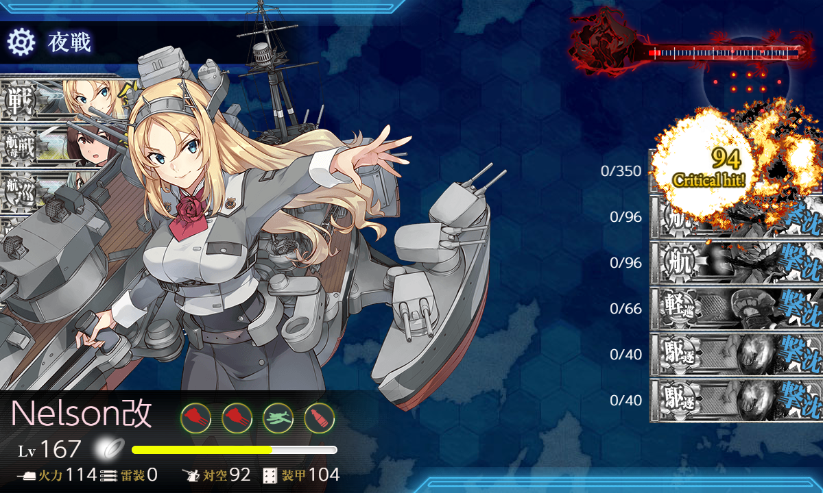 道中含めて細かい被弾が多めなのはちょっと気になりますが昼戦で空母棲姫だけにして最後はNelson。
