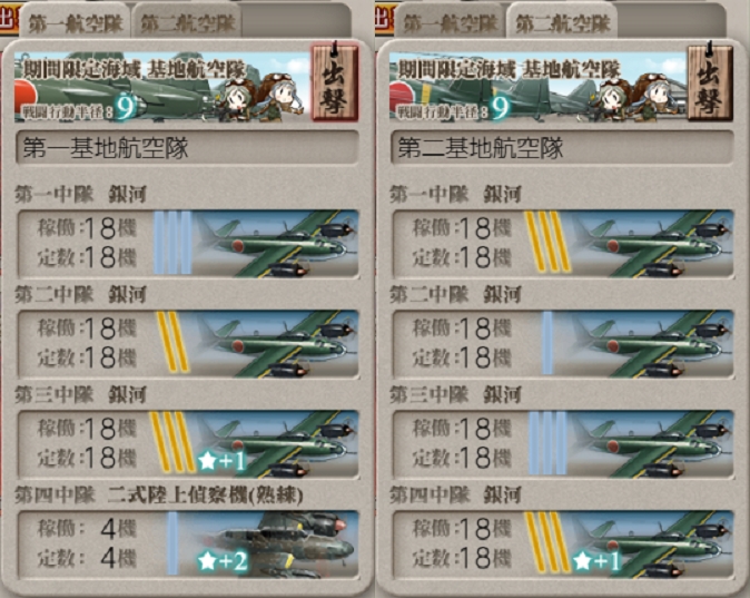 第一段階では"銀河"→"四式重爆 飛龍"とかでも良いんですが第二/第三段階ボスには行動半径5では届かないので注意。