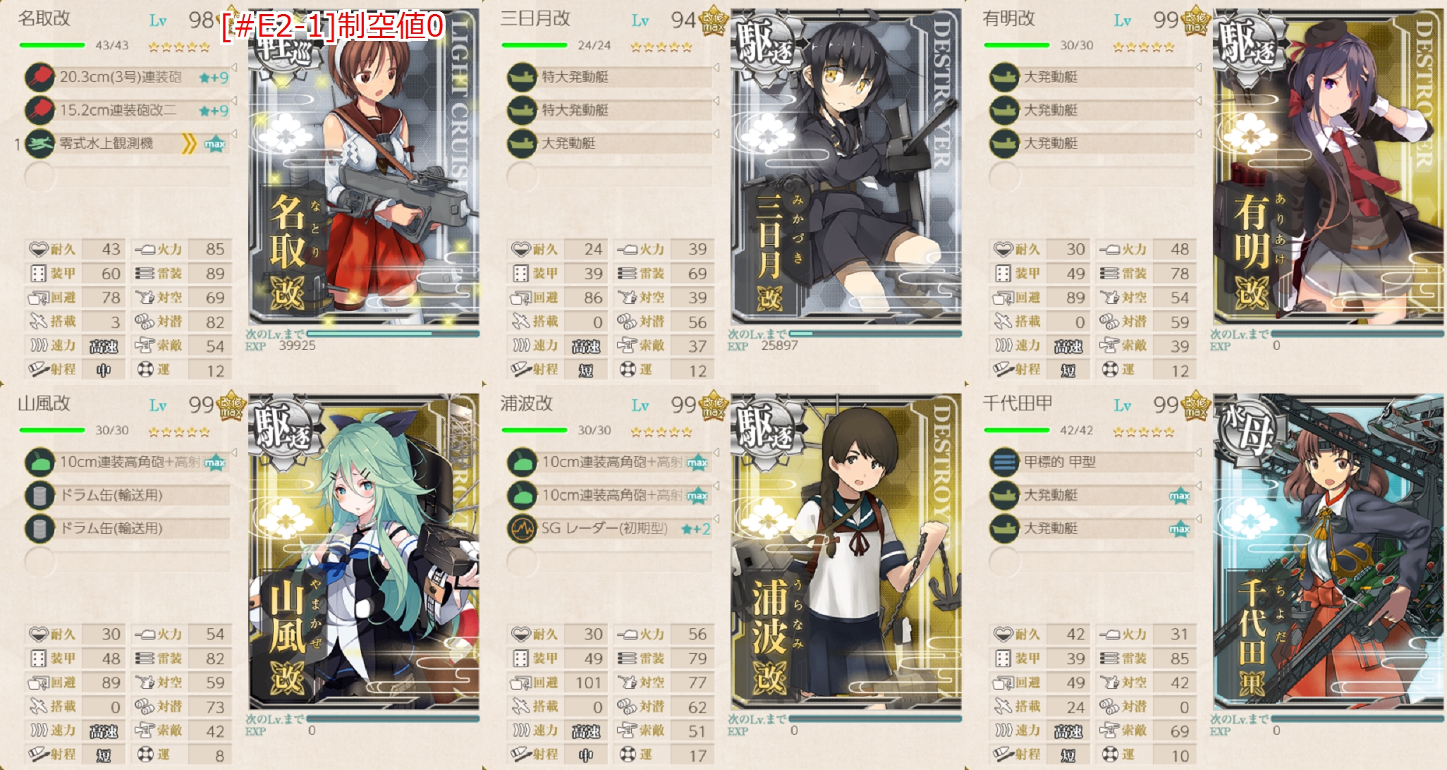 編成はベーシック?な軽巡、駆逐4、水母。 ただし練度は下は50未満で平均80未満だったせいか、撤退5回にボス戦