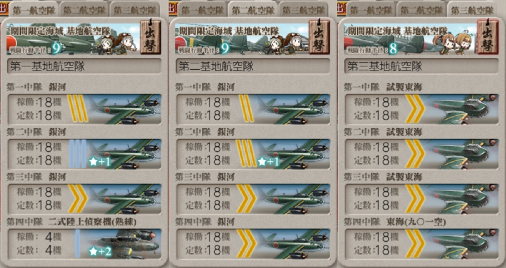 第一/第二航空隊は"銀河"多めにして"ボス(V)"に集中、第三航空隊は"東海"部隊にして"Qマス"に集中。