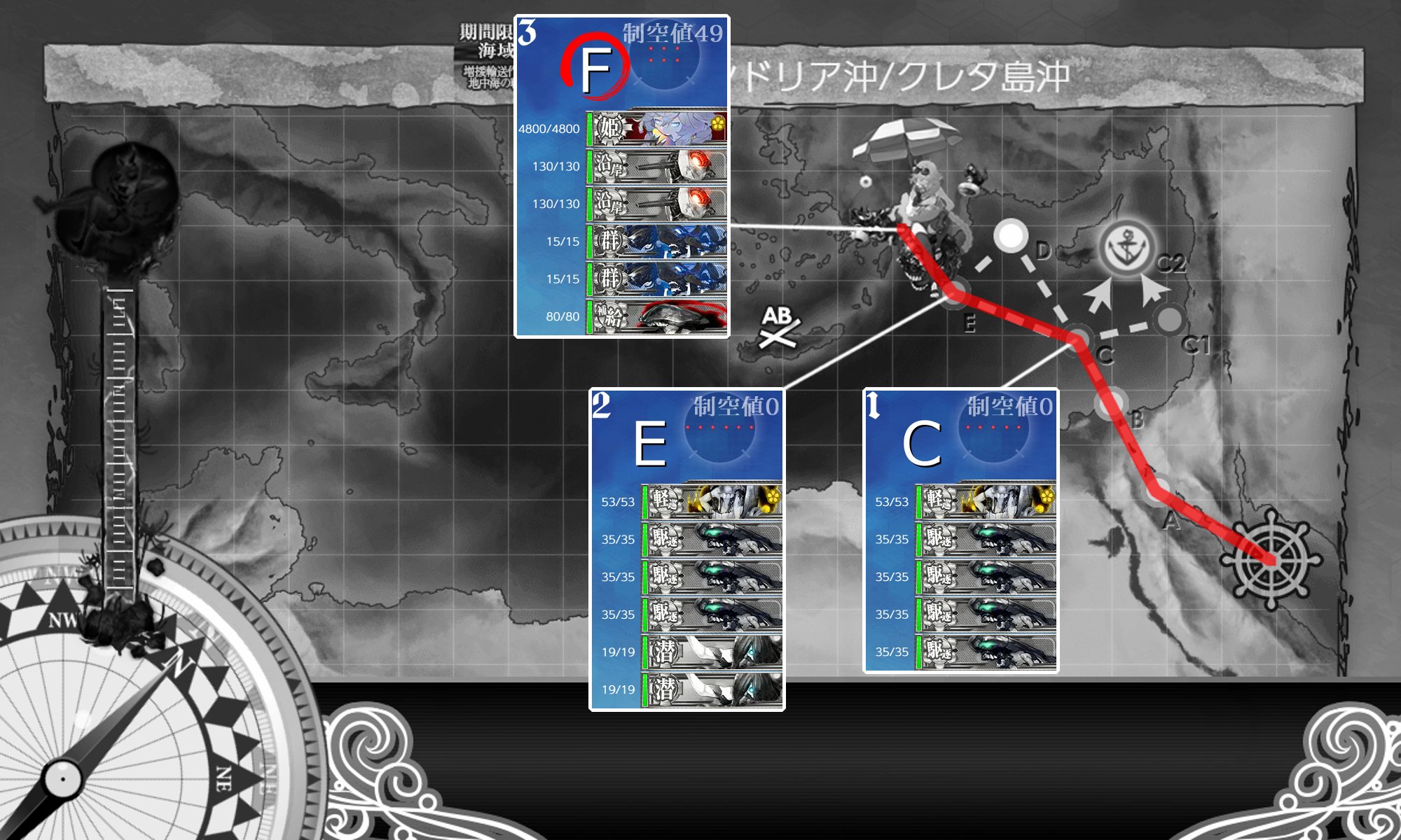 駆逐艦は大発3で上3隻が戦闘要員。道中警戒陣でしたが上3隻がよく働いたので支援なしでも