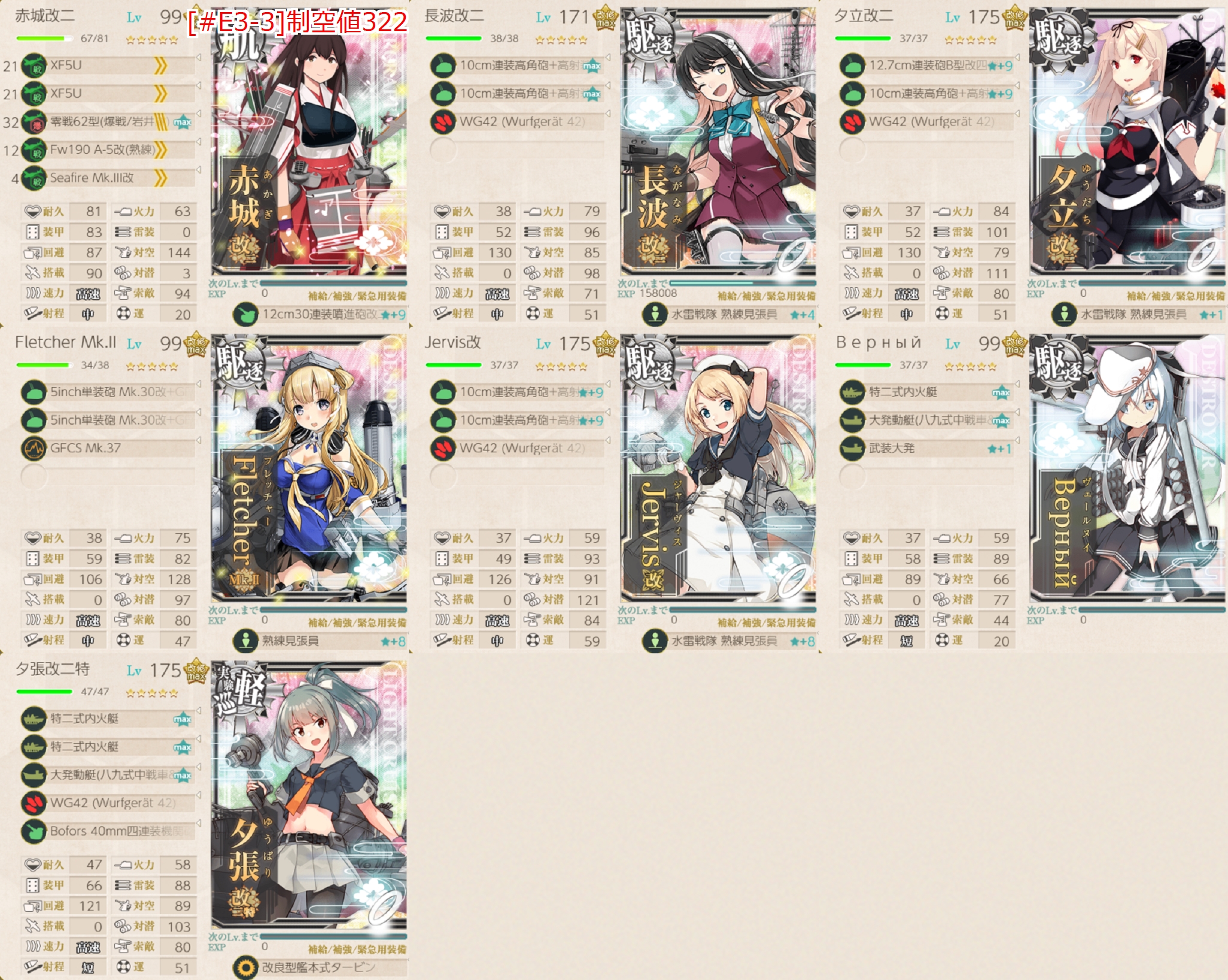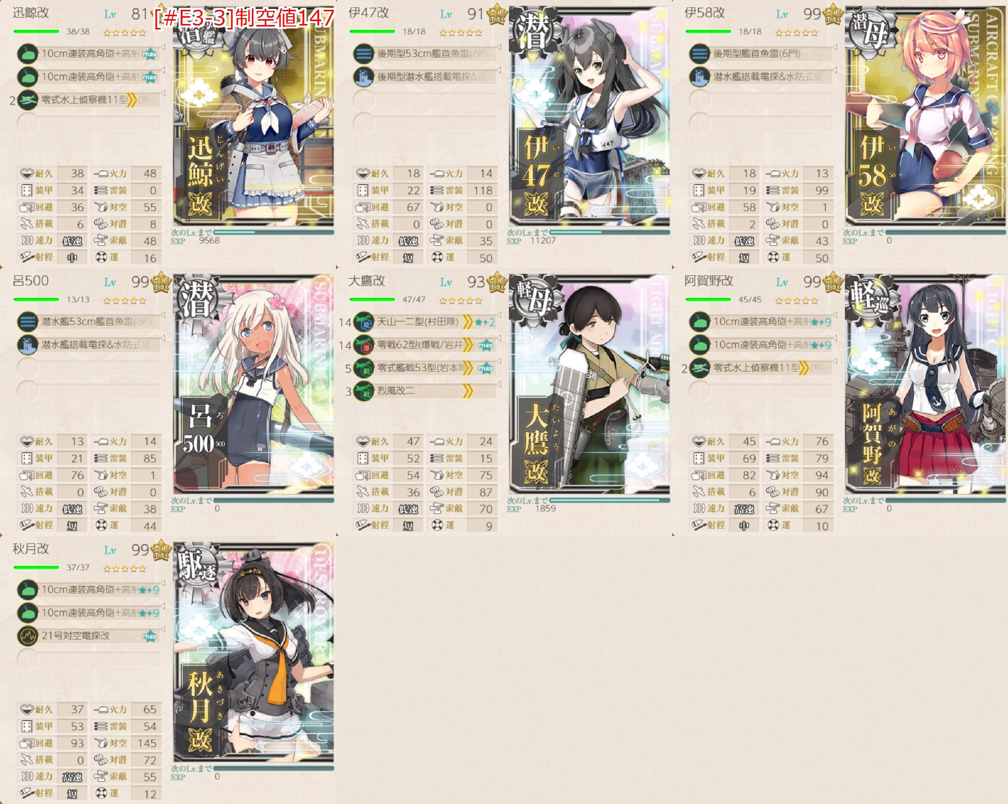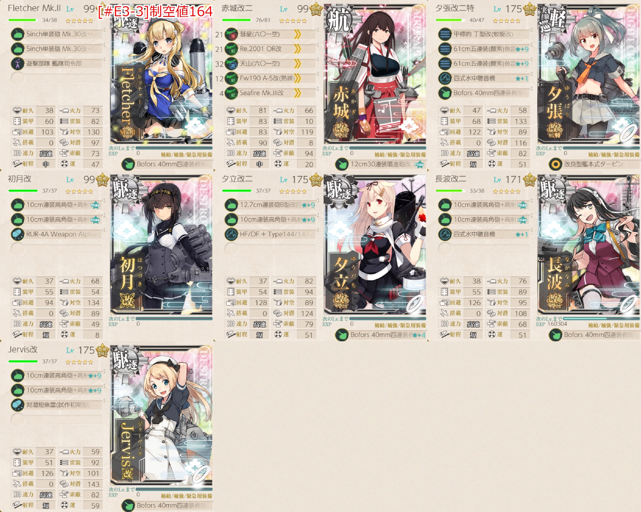 [#E3-1]編成で空母を入れてるはずなので問題ないはず。2戦目(B2)で航空拮抗↑が取れるように制空値142↑が目安。