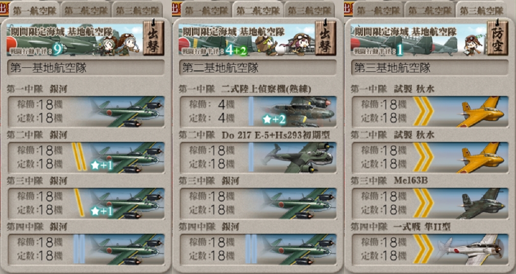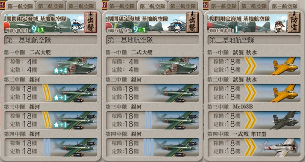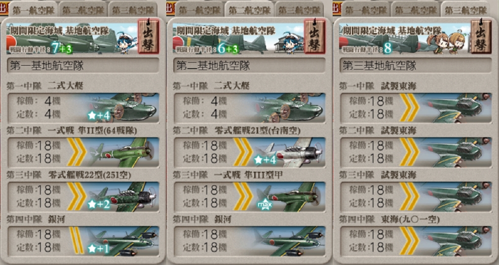 [#E3-3]本攻略でもこの"Xマス"に基地航空隊を送ってボス到達を重視する予定なので制空値削りがメインの2部隊。